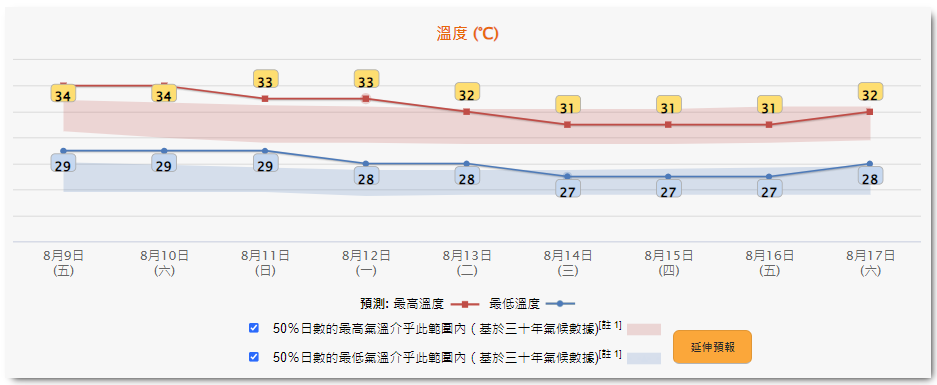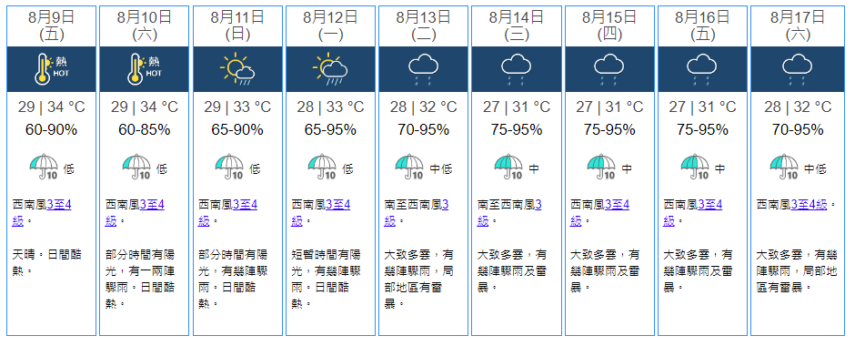 未來9天天氣預報。香港天文台圖 香港天文台預報,明日(10日)至下周一(12日)仍將會持續酷熱,明日最高氣溫達34℃,隨後兩日也有33℃,連日部份或短暫時間有陽光,有一兩陣或幾陣驟雨。 下周二(13日)至下周六(17日)均大致多雲,有幾陣驟雨及有雷暴。下周二(13日)及下周六(17日)料最高氣溫在32℃左右,其餘日子最高氣溫均在31℃左右。(完) 【編輯:豐悅】
