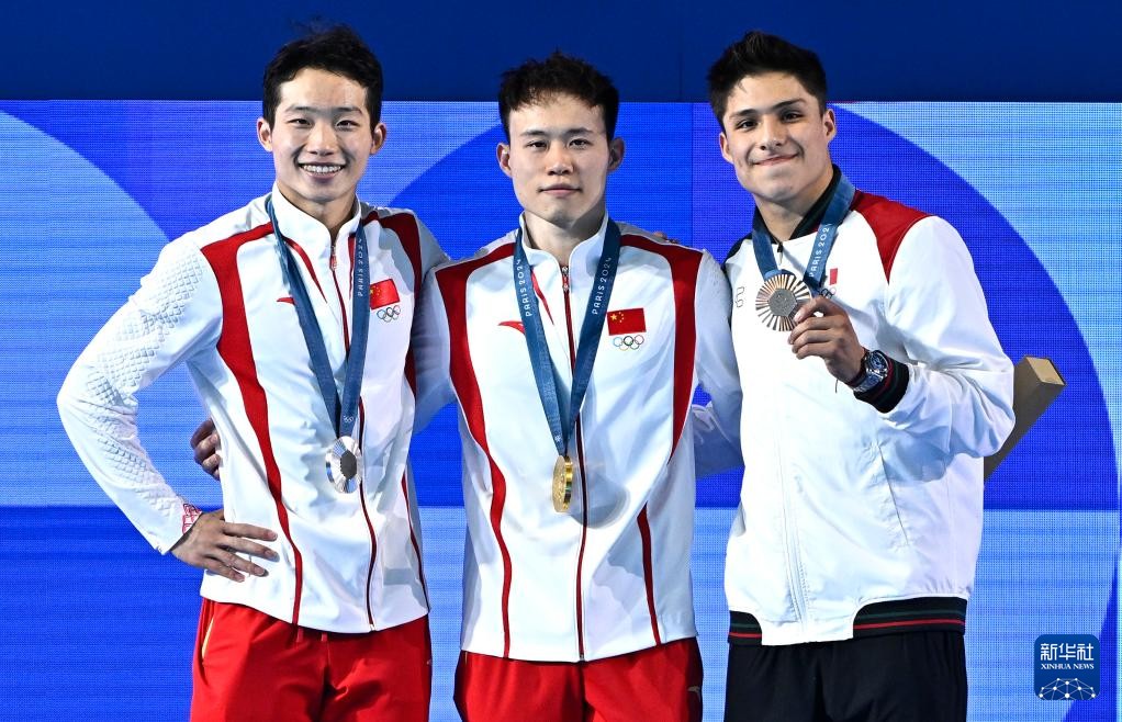 8月8日,金牌得主中國選手謝思埸(中)、銀牌得主中國選手王宗源(左)和銅牌得主墨西哥選手奧斯馬爾在頒獎儀式上。新華社記者 王鵬 攝
