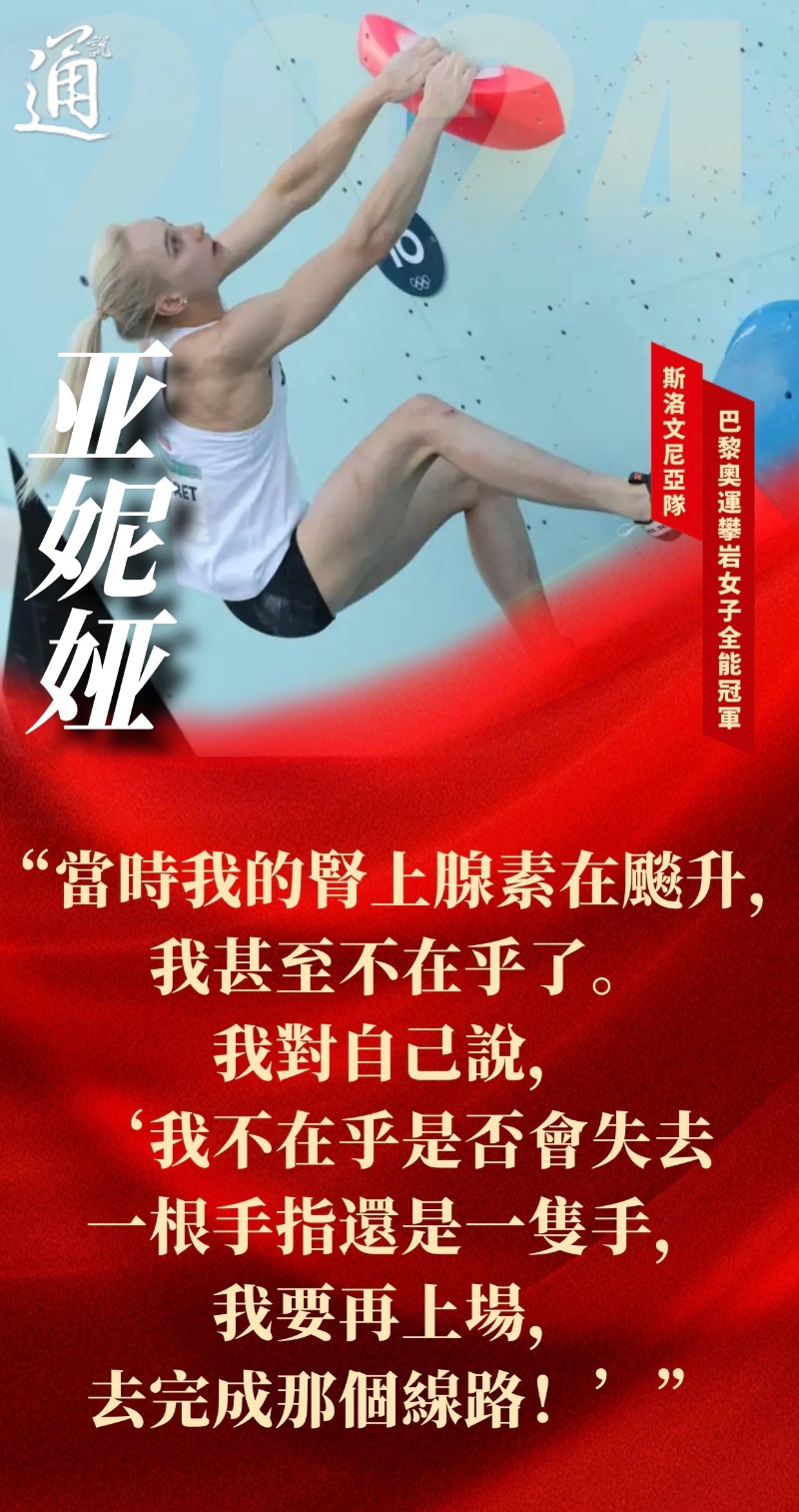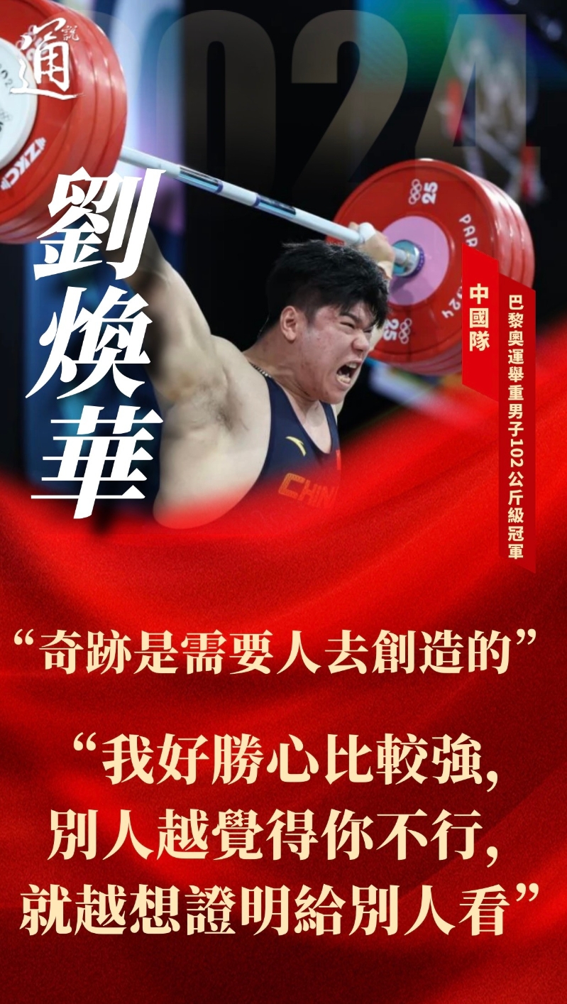 (巴黎奧運)冠軍語萃:好勝心創奇跡 擰成一股繩綻放巴黎香港中通社8月11日電 (香港中通社記者 王瑤)當地時間8月10日,巴黎奧運會來到倒數第二個比賽日。 “00後”小將扛起中國男舉大級別項目大旗,在舉重史冊上寫下自己的名字;斯洛文尼亞選手成為攀岩項目史上首位奧運雙金得主。在運動場上奮勇拼搏的體育健兒們,賽後亦留下許多話語,讓人們得以窺見他們榮耀背後的心路歷程。 10日的舉重男子102公斤級決賽中,劉煥華以總成績406公斤為中國舉重隊拿下首枚大級別奧運金牌。 為實現這一歷史性突破,劉煥華在三年內完成了81公斤級、89公斤級、96公斤級、102公斤級和109公斤級五個級別的跨越,有舉重界的“跨欄選手”之稱。 跨級別的最大挑戰是增重。為此,劉煥華曾一天吃四、五頓飯,晚上還要加餐。回想起來,他笑言“第一階段真的超幸福”,但很快就感受到了壓力,身體變得笨重,不像以前那麼靈活,很多熟悉的動作都變得陌生,需要重新調整。要想改變這種狀況,劉煥華必須玩命地訓練。 巨大的訓練量讓劉煥華非常痛苦,他回憶光踩單車就踩到要掉眼淚,一度問自己,“我為什麼要遭這個罪,我是不是要放棄?”但這種念頭轉瞬即逝,取而代之的是更刻苦的訓練。在舉重隊綽號“拼命三郎”的他,經常因超額完成訓練任務而被主管教練提醒別練過了頭。 “奇跡是需要人去創造的。賽場上能拼得出來,訓練積累也很重要。”劉煥華說:“我好勝心比較強,別人越覺得你不行,你就越想證明給別人看。”
