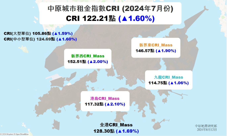 香港新聞網8月13日電 利率高企令香港樓市交易低迷。香港中原地產最新發佈7月份香港城市租金指數CRI環比上升1.6%,連續五個月上漲,創近五年來新高。業內人士表示,受美聯儲高利率的影響,買家目前只租不買,推高了租金,一旦降息,這種狀況會有改觀。 據香港中原地產昨(12日)最新發佈的7月份香港城市租金指數顯示,7月份CRI環比上升1.6%,達到122.21點,創下近五年來新高,接近2019年10月的水平。