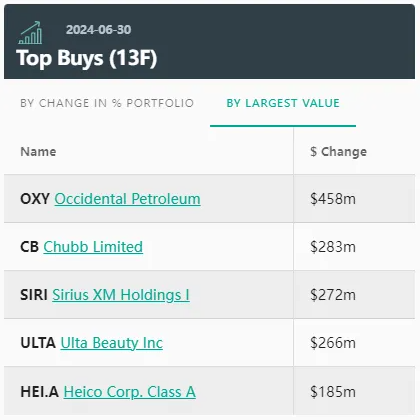 (圖源:image) 報告期內,伯克希爾新進了兩家公司的倉位,分別是美國最大美妝零售商Ulta美妝(ULTA.US),以及航空航天和電子公司HEICO。 雖然經過一番激烈的拋售,伯克希爾的主要持倉排序并沒有發生變化,蘋果、美國銀行、美國運通、可口可樂、雪佛龍依然佔據前五大持倉的位置。 附:伯克希爾二季度末持倉