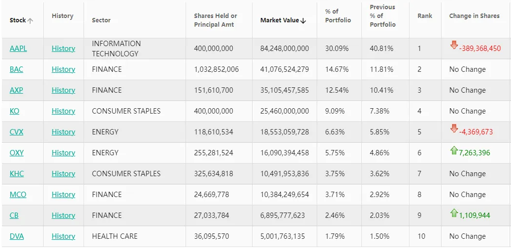 香港新聞網8月15日電 北京時間周四凌晨4時許,伯克希爾公司按照慣例拖到法定報告期的最後一天盤後,發佈截至2季度的美股持倉報告(13F表),巴菲特神秘持倉的股票終於被公開。 美東時間8月14日,巴菲特領導的伯克希爾哈撒韋公司向美國證監會(SEC)遞交的13F文件披露,以投資組合中佔比環比一季度的變動幅度看,今年第二季度,伯克希爾有五隻個股減持幅度最大,首位是蘋果(AAPL),當季減持逾3.89億股,市值約820億美元,持股數環比一季度減少49.3%,在投資組合中佔比環比下降超過10個百分點,降至30.52%。 以上數據和伯克希爾本月初公佈的二季度數據一致。在8月3日的伯克希爾二季報中,伯克希爾披露“腰斬蘋果持倉”引發全球市場關注。在那份財報中,伯克希爾披露公司大約減持750多億美元的股票,同時現金水平提升至驚人的2769億美元。其中年化收益率大概在5%左右的短期美債持倉升至2346億美元,比美聯儲還要多。