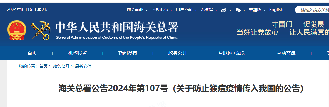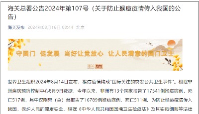 香港新聞網8月16日電今天(16日)早間,海關總署網站發佈防止猴痘疫情傳入中國的公告,以防止猴痘疫情傳入中國,保護人民的健康安全。