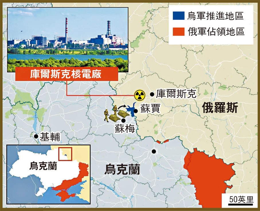 戰場示意圖 圖源:文匯網 在周日凌晨約1時40分,庫爾斯克核電廠響起導彈警報,其所在的庫爾恰托夫市上空首先傳來幾聲沉悶的爆炸聲,可能是防空系統攔截的聲音,1分鐘後,當地人員再聽到劇烈爆炸聲。另據俄國防部獲得的消息,從上周六晚上至周日凌晨,俄軍分別在庫爾斯克州、別爾哥羅德州及羅斯托夫上空,合共擊落5架無人機。 庫爾恰托夫市是一座核子科學城,距離庫爾斯克州邊境城鎮蘇賈約90公里。俄羅斯國家原子能集團公司總經理利哈喬夫上周六與聯合國核監督機構“國際原子能機構”(IAEA)總幹事格羅西通電話,討論核電廠周邊局勢,並邀請格羅西訪問庫爾恰托夫。 俄羅斯媒體上周六報道,俄國防部當天指控烏克蘭計劃襲擊俄境內的庫爾斯克核電廠,並會把這類“挑釁”行徑歸咎於烏克蘭,“如果發生此類攻擊,俄方會作出嚴厲回應。” 俄國防部還提到,攻擊核電廠將污染周邊大片區域。據路透社報道,烏部隊本月6日攻入庫爾斯克州,並宣稱從那天之後,烏軍已掌控1,150平方公里俄領土,並控制82條村落。 然而庫爾斯克核電廠目前仍處於俄方控制下。 另一方面,烏克蘭南部的扎波羅熱核電廠附近早前發生無人機攻擊事件後,俄羅斯上周六再指控烏克蘭在該核電廠投下爆炸物,IAEA警告說,核電廠安全狀況正在“惡化”。 (完) 【編輯:王少喆】