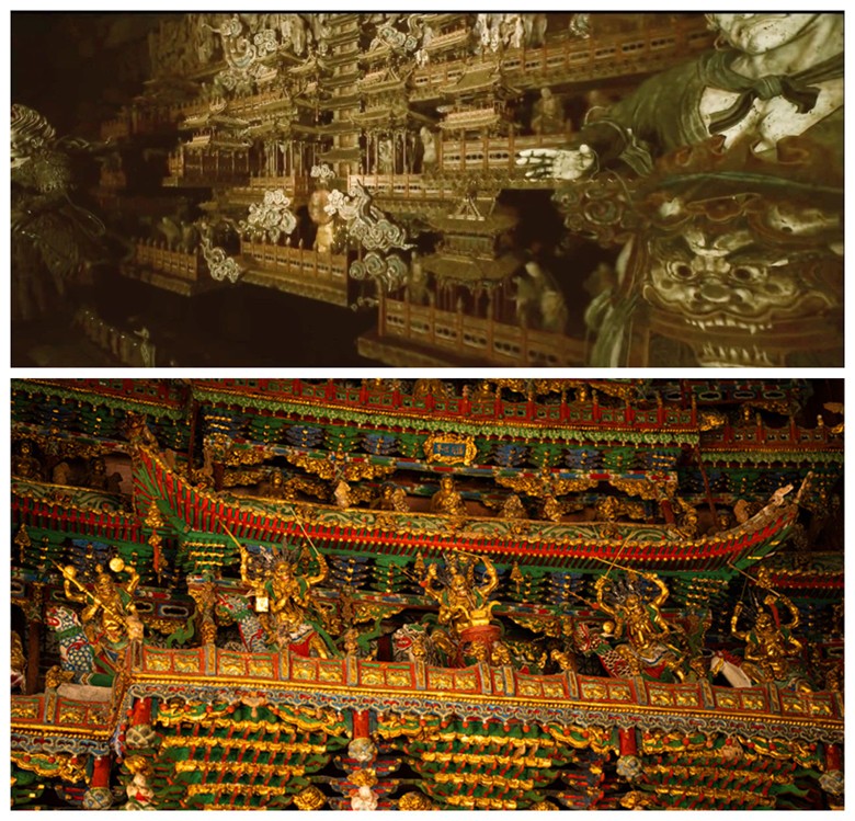 圖為游戲場景(上)和隰縣小西天大雄寶殿實景對比(下)。圖自山西文旅 小西天,又名千佛庵,位於中國山西省臨汾市隰縣城西鳳凰山巔,是一座佛教禪宗寺院,由明代東明禪師創建於明崇禎二年(公元1629年)。因大雄寶殿內有佛像千尊而得名,後因重門額題“道人西天”,又為區別城南另一座明代寺院“大西天”而更名為“小西天”。