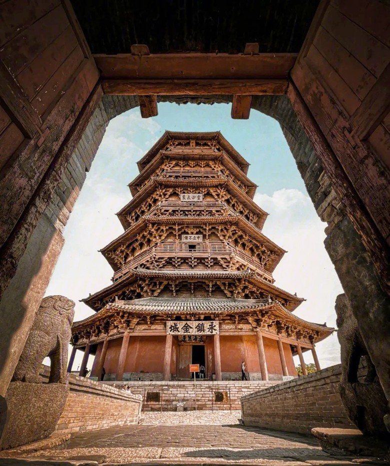 小西天大雄寶殿內的明清懸塑,是中國國內稀有的滿堂貼金懸塑精品。圖自山西文旅 【應縣木塔】 《黑神話:悟空》游戲里的那座通天寶塔,原型正是大名鼎鼎的應縣木塔,也就是應縣佛宮寺釋迦塔。