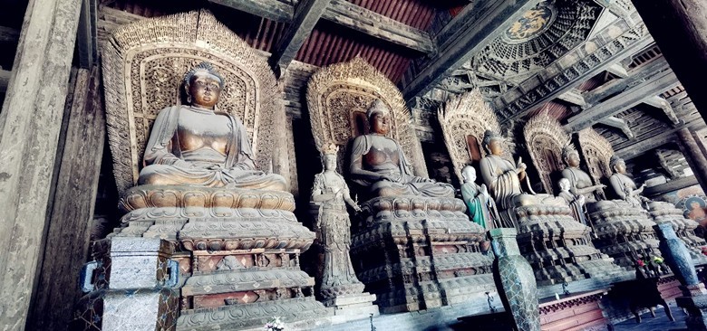 善化寺大雄寶殿。圖自大同市平城人民政府官網 殿內皆減少了中間兩排柱子,空間高廣空曠。在方便禮佛的同時,更有涼風習習之感。