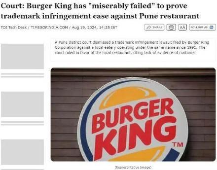 香港新聞網8月22日電 印度馬哈拉施特拉邦浦那地方法院日前公佈裁決,駁回了美國快餐連鎖品牌漢堡王對印度當地同名餐廳發起的一項長達13年的侵權訴訟。 2011年,美國漢堡王作為原告,指控位於浦那的“漢堡王”餐廳商標侵權,尋求法院批准永久禁令,并要求對方賠償損失和停止使用該名稱。