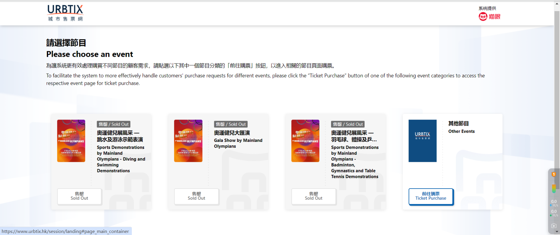 市民可於城市售票網以網上、流動應用程式或電話購票方式購買,每張20港元每人每次限購2張。 記者實測,當日早10點準時進入系統,跳水及游泳示範表演已有逾2萬人排隊;開售約10分鐘,有近5萬人輪候購買羽毛球、體操及乒乓球示範表演項目門票,逾4萬人及近3萬人分別輪候游泳及大匯演門票,3場活動均要等候逾2小時才能進入購票界面。 有網友更指出,儘管順利進入購票界面,但仍無法鎖定座位,需要不斷刷新。在選定座位後,因活動實名制,需填寫資料再進入付款流程,總共需時5分鐘。 而電話購票方面,記者則一直呼叫失敗。網頁約於10點40分顯示,三場演出共5300張門票均已售罄。(完) 【編輯:張明臻】