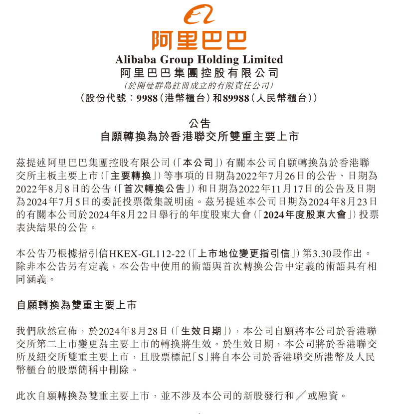 阿里巴巴公告。 據了解,2022年7月,阿里巴巴提出在香港主要上市的申請,期望擴大投資者基礎及帶來新增的流動性,惟同年11月再發公告指,考慮到各種因素,包括不斷變化的市場及其他外部環境,決定不會按原計劃在2022年底完成主要上市。 數據顯示,2019年阿里巴巴在香港第二上市以來,大部分公眾流通股已轉倉到香港,在市值和交易量方面,阿里一直位列港股前三名,主要上市水到渠成。如今,阿里巴巴在香港和紐約雙重主要上市,將進一步擴大來自中國內地及亞洲其他地區的投資者基礎,促進股東結構多元化,提升阿里港股的流動性,也為投資者在公開市場持有及交易阿里股份提供更大的靈活性。 公告還顯示,阿里在香港雙重主要上市不涉及新股發行和融資。 由於阿里為同股不同權公司,根據內地規定,其港股通考察日為其轉換為主要上市後的恒生綜合指數成分股定期調整生效日前的第2個港股交易日,屆時如符合《實施辦法》等規定條件則納入港股通。 市場廣泛期待阿里在完成香港雙重主要上市後,最快有望於9月納入港股通。其中,摩根士丹利在研報中展望,納入港股通後,從長期來看,南向資金持股占比可能會穩定超過10%,預計將為公司價值提供可觀的增量支撐。(完) 【編輯:錢林霞】