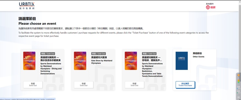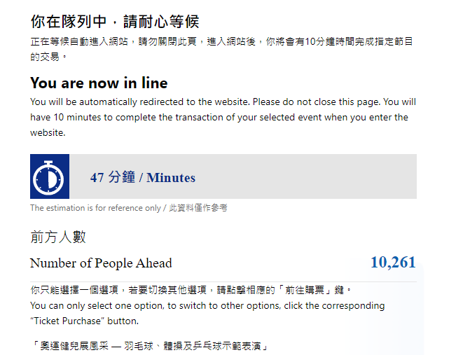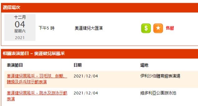 (香港中通社資料圖) 據公布,代表團成員來港後將出席3場公開活動,包括30日晚上於伊利沙伯體育館舉行的奧運健兒大匯演,以及31日上午分別於伊利沙伯體育館和維多利亞公園游泳池舉行的兩場內地奧運健兒展風採運動項目示範。 市民可於城市售票網以網上、流動應用程式或電話購票方式購買,每張20元(港幣,下同)每人每次限購2張。 香港新聞網記者實測,當日早上10點進入系統,羽毛球、體操及乒乓球示範表演項目已湧入逾萬人搶購門票,系統提示記者需等待約40分鐘。待終於排到位置、進入購票界面後,記者仍無法鎖定座位,需不斷刷新。無奈系統很快顯示門票已售罄,記者無法購買。