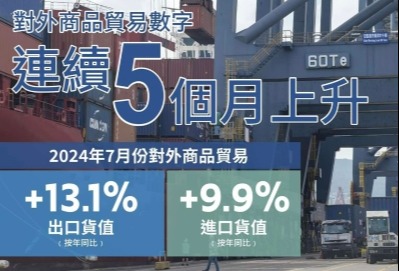 1.香港特區政府統計處27日發表對外商品貿易統計數字顯示,7月香港整體出口和進口貨值均錄得按年升幅,分別上升13.1%和9.9%。兩者分別較6月加快2.4和0.9個百分點,連升5個月。