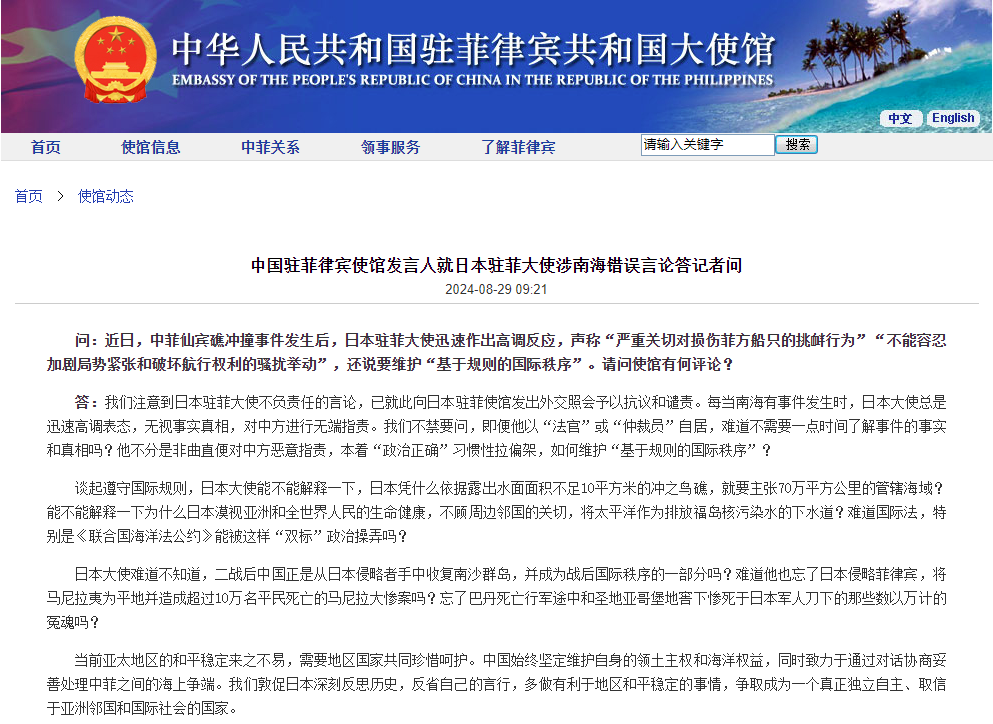 中國駐菲律賓大使館官網截圖 中國駐菲律賓大使館官網29日消息,發言人說,每當南海有事件發生時,日本大使總是迅速高調表態,無視事實真相,對中方進行無端指責。我們不禁要問,即便他以“法官”或“仲裁員”自居,難道不需要一點時間了解事件的事實和真相嗎?他不分是非曲直便對中方惡意指責,本著“政治正確”習慣性拉偏架,如何維護“基於規則的國際秩序”? 發言人表示,談起遵守國際規則,日本大使能不能解釋一下,日本憑什麼依據露出水面面積不足10平方米的沖之鳥礁,就要主張70萬平方公里的管轄海域?能不能解釋一下為什麼日本漠視亞洲和全世界人民的生命健康,不顧周邊鄰國的關切,將太平洋作為排放福島核污染水的下水道?難道國際法,特別是《聯合國海洋法公約》能被這樣“雙標”政治操弄嗎? 發言人強調,日本大使難道不知道,二戰後中國正是從日本侵略者手中收復南沙群島,並成為戰後國際秩序的一部分嗎?難道他也忘了日本侵略菲律賓,將馬尼拉夷為平地並造成超過10萬名平民死亡的馬尼拉大慘案嗎?忘了巴丹死亡行軍途中和聖地亞哥堡地窖下慘死於日本軍人刀下的那些數以萬計的冤魂嗎? 發言人指出,當前亞太地區的和平穩定來之不易,需要地區國家共同珍惜呵護。中國始終堅定維護自身的領土主權和海洋權益,同時致力於通過對話協商妥善處理中菲之間的海上爭端。我們敦促日本深刻反思歷史,反省自己的言行,多做有利於地區和平穩定的事情,爭取成為一個真正獨立自主、取信於亞洲鄰國和國際社會的國家。(完) 【編輯:丘志彬】