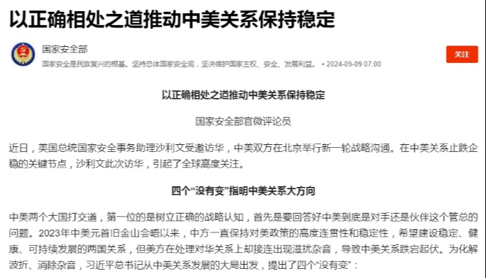 (圖源:中國外交部網站) 中方形容雙方“進行了坦誠、實質性、建設性討論”。王毅表示,中美關係歷經跌宕起伏,梳理其中的經驗教訓,有助於更好開闢未來,找到中美兩個大國的正確相處之道。沙利文表示,美方願同中方繼續保持戰略溝通,增進相互了解、減少誤解誤判。 北京外國語大學英語學院美國研究中心副教授齊皓29日向香港中通社表示,沙利文此行的目的就是穩定中美關係,希望不要在拜登政府剩下的這幾個月發生大規模衝突,但要改善中美關係或者說促進在一些領域的合作可能性很小。 齊皓表示,如果說穩定的點,其一是台海,拜登政府首先認為對於台海,也就是美台關係的加強,他做了很多事情,然後也有了像佩洛西竄訪台灣這樣的事發生,所以雙方還是在明確這個底線,不希望在這個事情上發生衝突,“我覺得這個是他所關心的”。 在台海問題上,王毅強調,“台獨”是台海和平穩定的最大風險。美方應當把不支持“台獨”的承諾落到實處,恪守一個中國原則和中美三個聯合公報,停止武裝台灣,支持中國和平統一。沙利文表示,美方堅持一個中國政策,不支持“台灣獨立”,不支持“兩個中國”,不支持“一中一台”。 其二是南海問題。齊皓認為菲律賓或者說中菲在南海仁愛礁附近的衝突持續不斷,雖然達成了一個暫時性的協議,但仍然沒有用。現在美國實際上對於菲律賓的承諾已經很具體,然後也希望給菲律賓提供這種援助,尤其是在仁愛礁附近的巡航和補給。所以在這個情況下,這種溝通是希望中國在這個問題上,採取一種合適的態度,不要在南海發生了一個衝突的升級,這都是拜登比較關心的。 除此之外,齊皓認為拜登政府馬上就要結束了,現任政府還是希望他們在對華政策上是有成果的,他們希望穩定這種成果。否則對民主黨的選情是不好的,會影響哈里斯的當選。 有分析認為,對於此次沙利文訪華,中美都將此定位為“戰略溝通”,所涉議題廣,聚焦在雙邊、地區及全球議題上直接、深層次的溝通。也正如外界普遍認為,此次沙利文訪華目的不是要為中美關係取得新的突破或進展,而是要通過戰略溝通延續過去一年中美關係的穩定勢頭,避免在未來幾個月出現新的危機。 值得注意的是,白宮在上周的簡報會上表示,中美已經找到了在競爭中可以開展合作的一些重要領域,也找到了開展合作的建設性方式。而從中方在新一輪戰略溝通後發放的消息,也確實如此。沙利文表示,美中之間有分歧,有競爭,也有很多需要合作的領域。 中美還就兩國元首近期開展新一輪互動進行了討論。同意繼續落實兩國元首舊金山會晤重要共識,保持高層交往和各層級溝通,繼續開展禁毒、執法和非法移民遣返合作、應對氣候變化等領域合作。同意適時舉行兩軍戰區領導視頻通話、第二輪中美人工智能政府間對話等機制性安排。(完) 【編輯:彭玉婷】