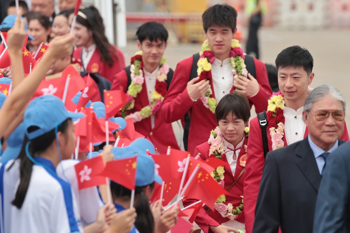 香港中通社記者 徐嘉儀 香港學生許同學為了自己的偶像全紅嬋而來,因水底漂亮的一記轉身而迷上她後,許同學便一直期待能與偶像見面。為此她特別準備了“大禮包”,跑了多家店鋪買了十隻全紅嬋喜歡的“小烏龜”,只為和全紅嬋說聲“加油”。 兩位中國乒乓“迷弟”何同學和黃同學今次特別從寧波和順德趕來,只為見上中國“乒乓天團”運動員們一面。受“偶像”感染,何同學努力練習乒乓球,希望有朝一日能與偶像並肩。“他們的精神感染了我,我也想學乒乓球。”黃同學告訴中通社記者,為此他和媽媽提前4個小時就來到運動員下榻的酒店。 真誠與友善 29日中午12時許,巴黎奧運會內地奧運健兒代表團乘坐飛機抵達香港國際機場,香港各界代表在機場舉行歡迎儀式。香港政務司司長陳國基、文化體育及旅遊局局長楊潤雄、港協暨奧委會會長霍震霆等到場迎接。 在警察銀樂隊奏響的《歡迎進行曲》中,團長、國家體育總局局長高志丹帶領一眾運動員步出機艙。160名少年警訊成員帶上警方公共關係部推出的吉祥物“豆苗仔”公仔,到機場停機坪接機,喜愛公仔的全紅嬋接過“豆苗仔”愛不釋手。
