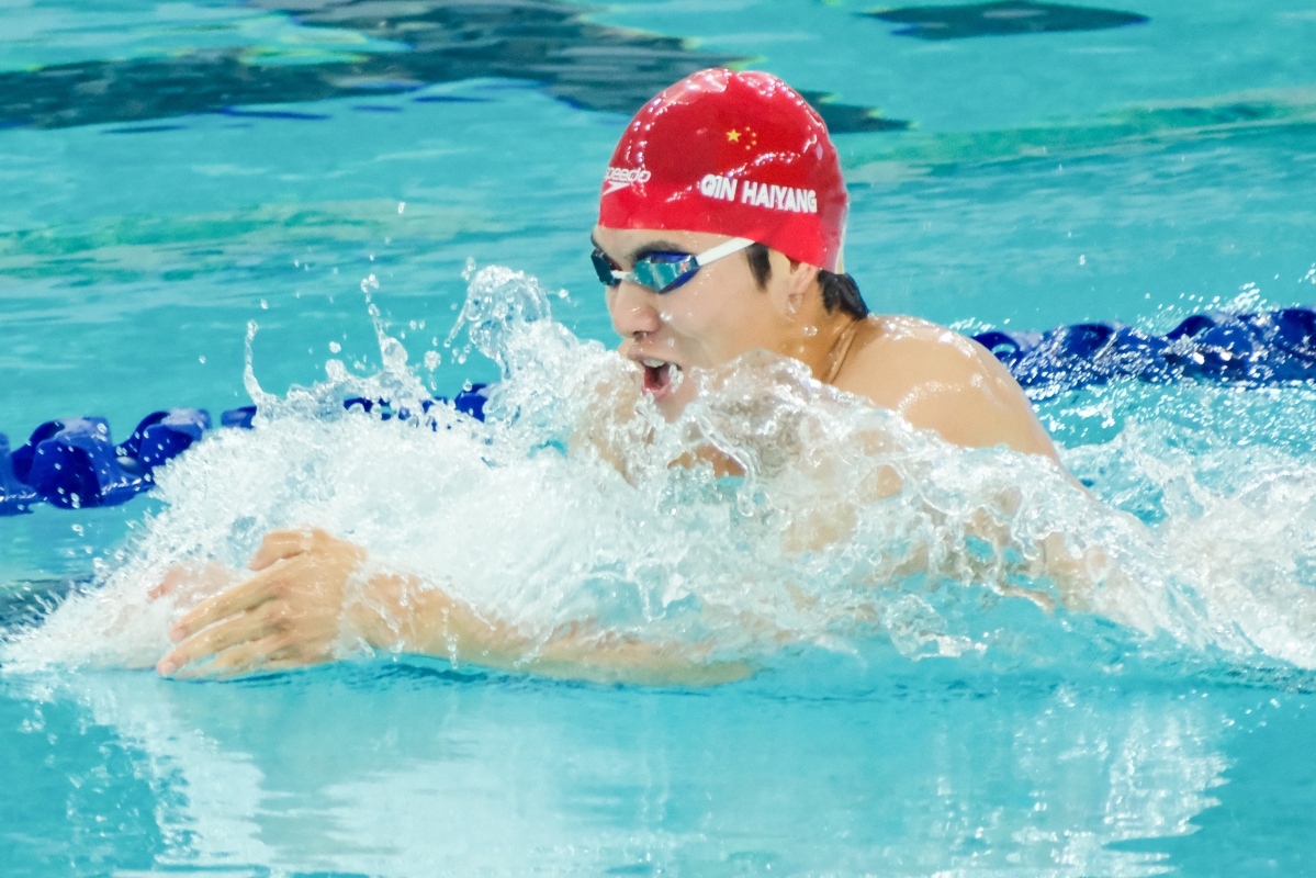 中國男子游泳隊隊員覃海洋示範蛙泳