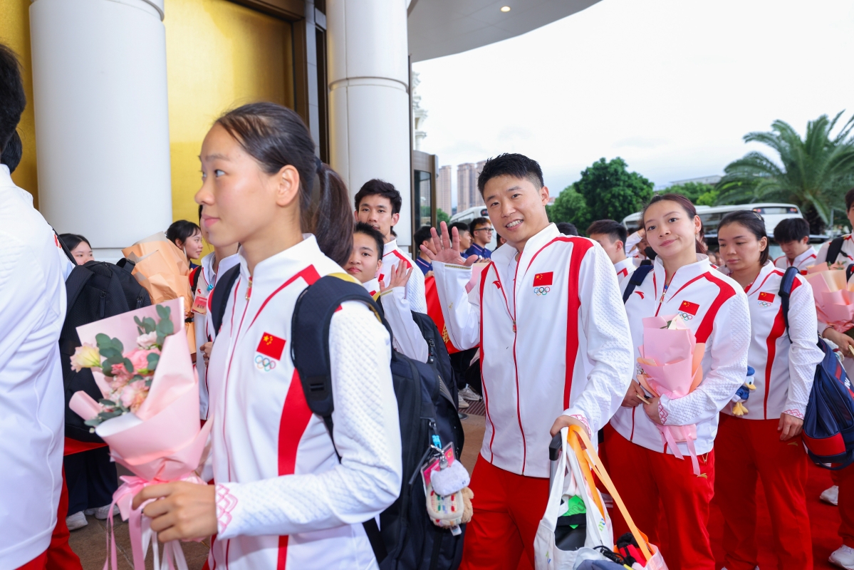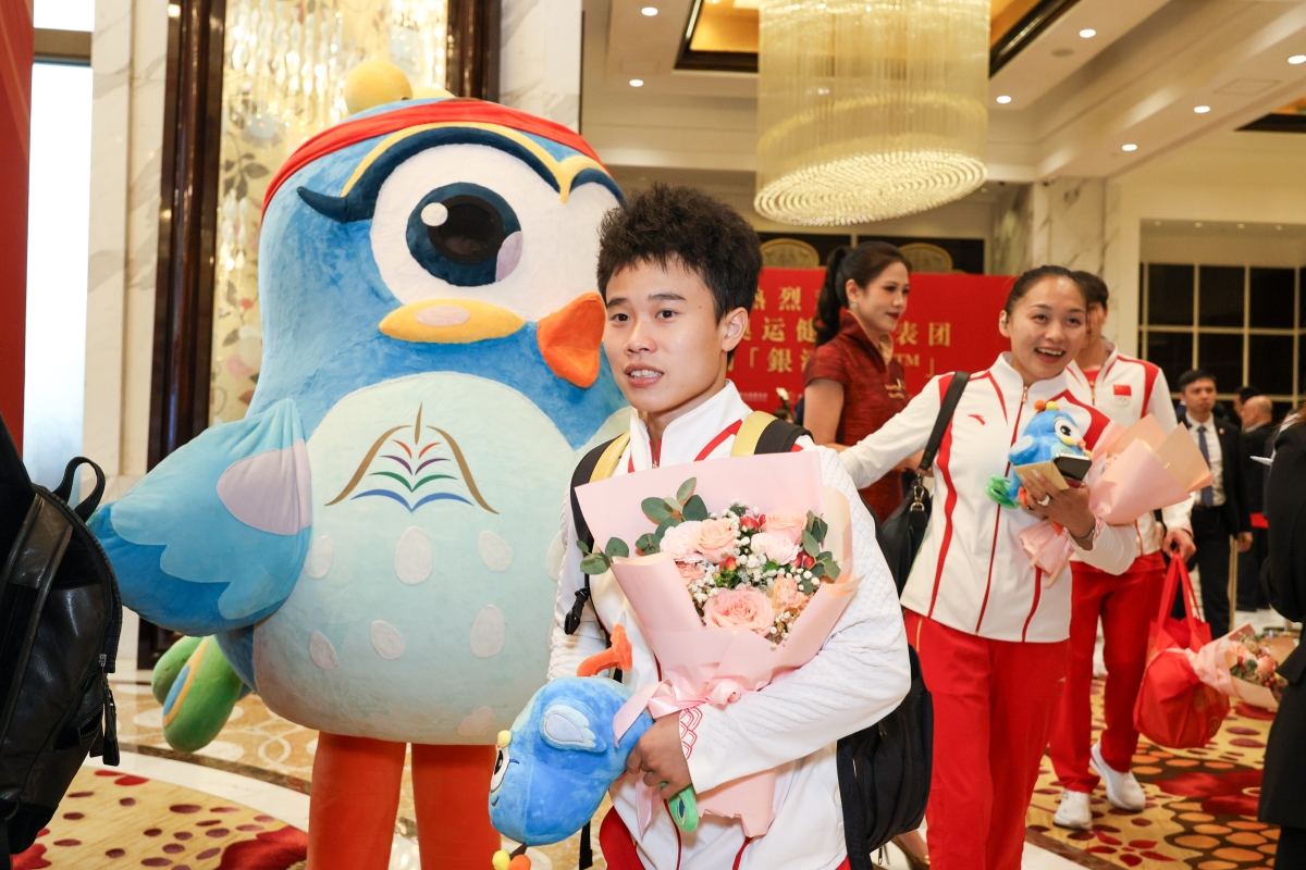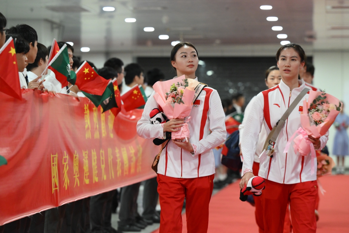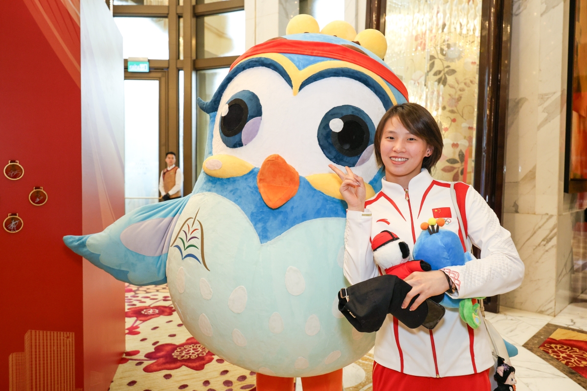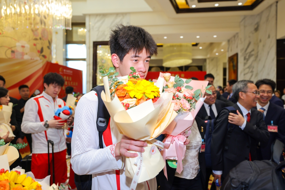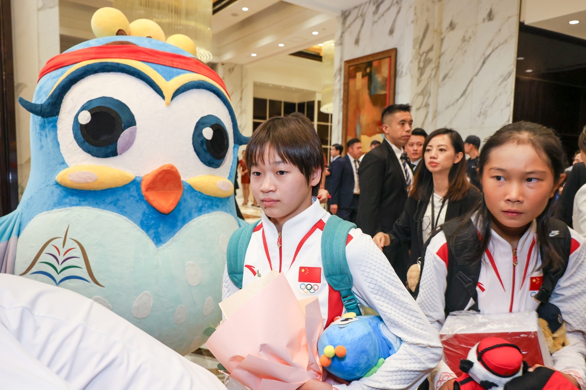 香港新聞網澳門8月31日電 國家奧運健兒代表團8月31日從香港經港珠澳大橋抵澳,開展為期三日的行程,現場約150名學生及不少遊客歡迎代表團。 代表團行程包括與澳門青少年互動交流、參與大型聯歡晚會、參觀地標景點及探訪社區等。當日,銀河娛樂集團在銀河酒店大堂為奧運健兒代表團舉辦歡迎儀式,熱情接待代表團入住。澳門特別行政區政府體育局代局長張子軒及代副局長李詩靈,銀娛副主席呂耀東、董事程裕昇以及企業事務董事林志成在現場迎接,逐一向每名代表予以誠摯的歡迎。期間,多名運動員在獎牌牆留下親筆簽名,並接受由澳門弱智人士家長協進會成員為奧運健兒用心製作的歡迎花束,以及深受旅客歡迎的“童”在銀河的孔雀“小淘淘”紀念品。