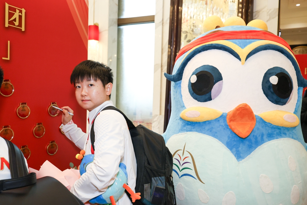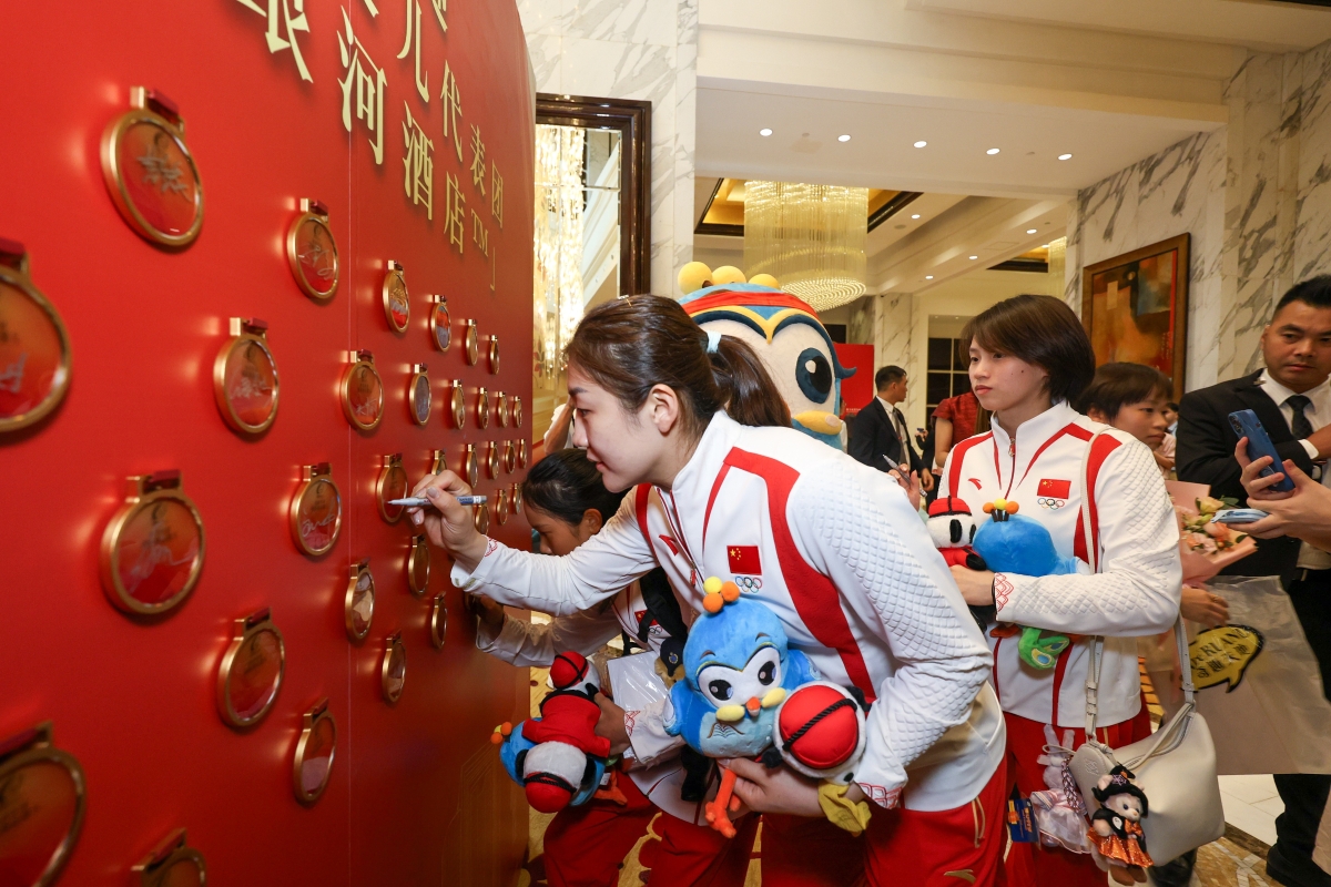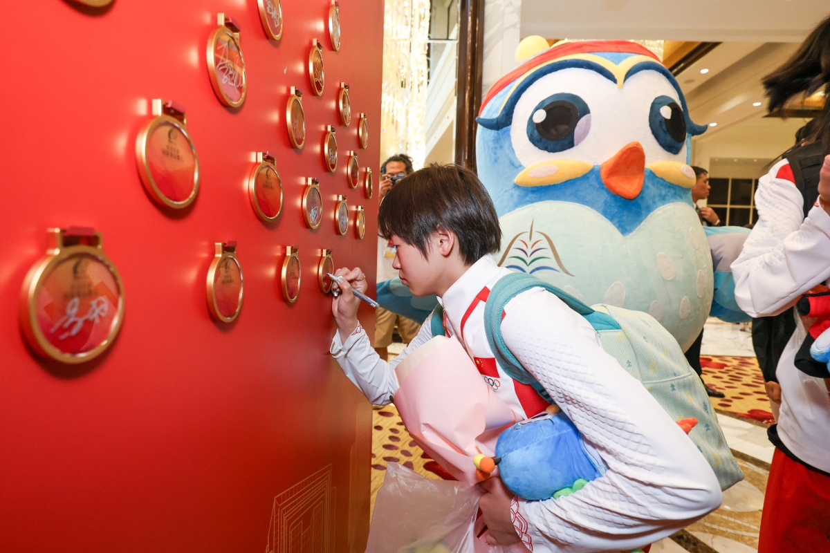 全紅嬋和多名運動員在獎牌牆下親筆簽名