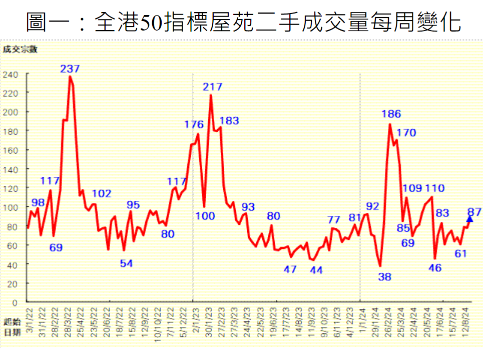香港新聞網9月4日電 九月美國減息高唱入雲,兼逢一手新盤未有大型項目推出爭客,購買力遂在二手市場尋寶,爭取實際減息前仍可低價入市的機會。香港地產商利嘉閣地產分行數據顯示,全港50個指標屋苑於上周(8月26日—9月1日)共錄87宗買賣個案,較前周增加12%,創自6月初以後的十二周新高。
