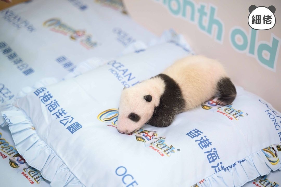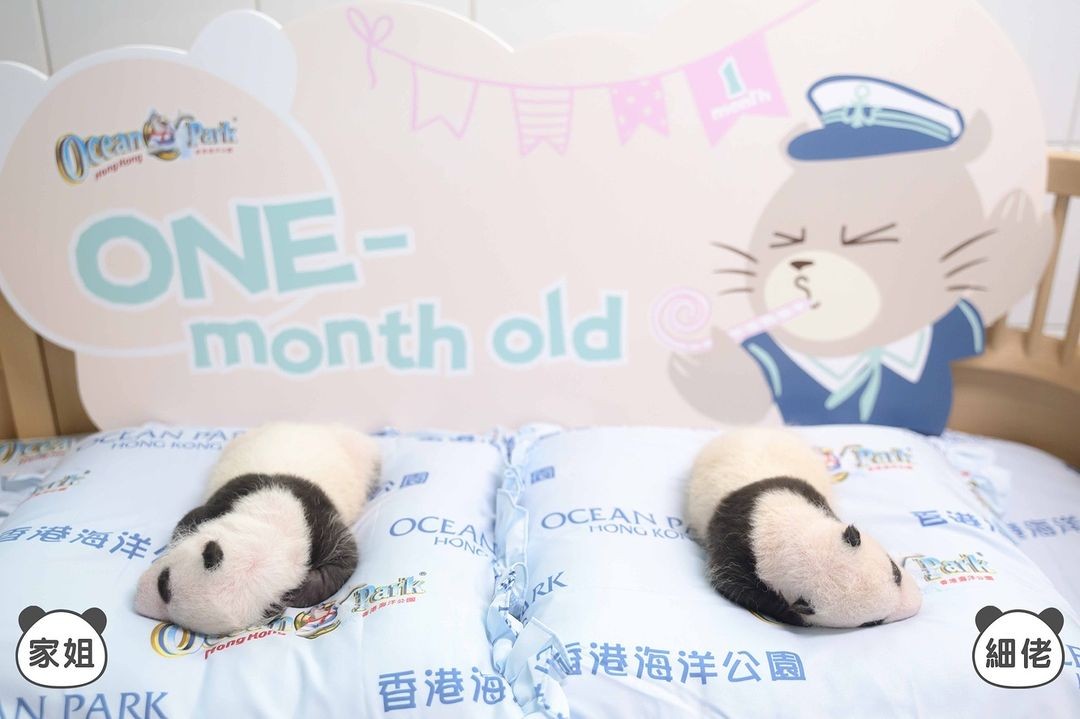 圖源:海洋公園大熊貓ins專頁 園方亦發布多張大熊貓寶寶的最新照片。照片中可以看到,寶寶們身上的毛髮開始變得濃密鬆軟,毛色也已黑白分明。滿月的大熊貓寶寶看上去約有成年人手掌大小,雙眼仍未睜開。這對姐弟俯臥在兩個大枕頭上休息,更襯出其小巧的身形。