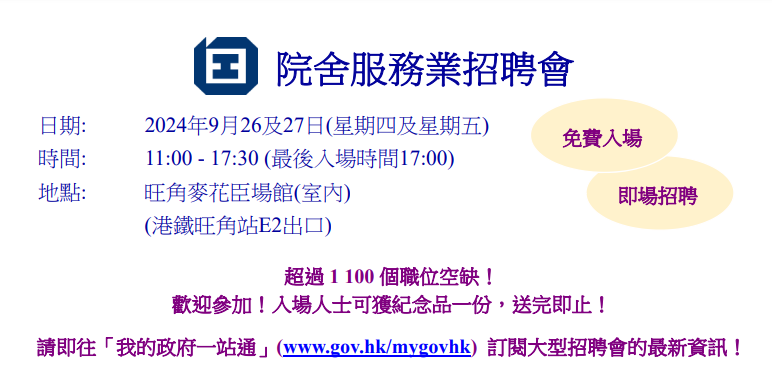 香港新聞網9月23日電 香港特區政府勞工處於26日及27日在旺角麥花臣場館舉行大型招聘會,為求職人士提供大量院舍服務業的職位空缺。 為期兩日的招聘會共有約30間機構參加,合共提供超過1100個優質院舍服務業職位空缺。參加機構將於會場設置櫃位,進行即場招聘,提供的職位類別相當廣泛,包括護理員、言語治療師、職業治療師、社工、護士、保健員、司機、廚師、活動助理、文員等。求職人士如欲進一步了解空缺詳情,可瀏覽勞工處的互動就業服務網站。