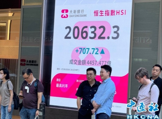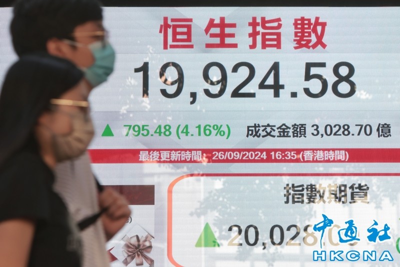 香港中通社9月26日電(記者 徐嘉儀)中央出“組合拳”救市後,再有提振經濟的消息,刺激A股港股市急升。恆生指數創逾一年新高,26日收市報19924點,升795點。大市成交額飆至3028億港元。 當天,恒指高開173點,報19302點,升幅曾收窄至47點;之後上海派消費券的消息刺激消費股,港股重拾動力,半日升443點。午後消息指內地將加大財政貨幣政策逆周期調節力度,港股升勢進一步加劇,恒指急升824點,高見19954點。