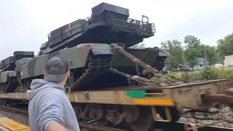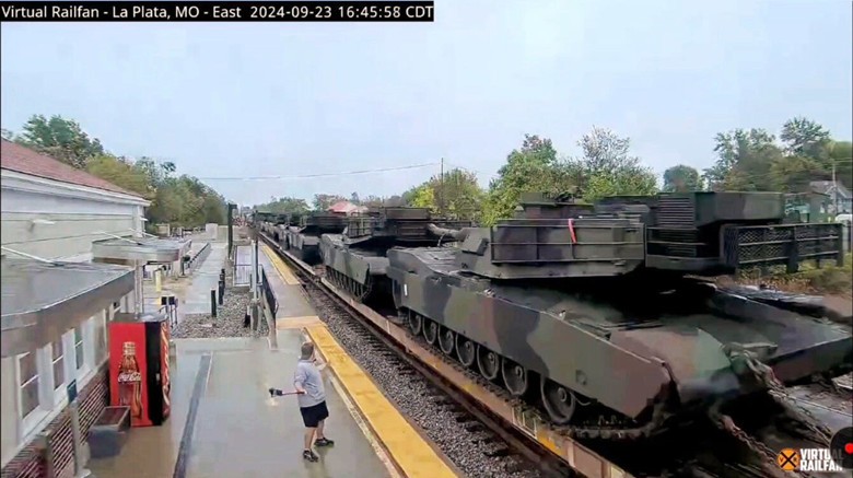 美國鐵路愛好者上傳的車站監控攝像頭畫面。圖自社交媒體 據台灣“聯合新聞網”26日報道稱,根據美國當地鐵路愛好者於當地時間25日晚在互聯網上傳的視頻顯示,首批出售給台灣當局的M1A2T坦克已經在貨運列車上通過鐵路向西運輸,預計即將在美國西海岸港口裝船運至台灣。 對此,台灣軍事專家盧德允25日晚在“臉書”發佈貼文稱“M1A2T快來了”,還附上一段據信是攝於美國密蘇里州拉普拉塔鐵路車站的畫面。畫面顯示,當地時間9月23日下午4時45分許,一列隸屬北伯靈頓和聖塔菲(BNSF)鐵路公司的貨運列車運載了12輛M1A2坦克向西南方的堪薩斯市行駛,即將運往美國西海岸。 報道表示,美國鐵路愛好者在社交媒體X發表圖文,顯示這批坦克并未進行任何偽裝遮蔽,塗有嶄新的歐洲北約三色迷彩。炮塔後方可見裝有輔助冷卻與動力系統,是在M1A2S基礎上研製的特征,美國出售給科威特的M1A2K也具備這一特點,根據台防務部門此前公佈的M1A2T系統配置圖,這批車正是為台軍設計的M1A2T坦克。