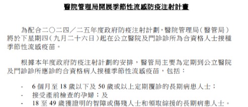 香港新聞網9月27日電 香港醫院管理局發言人27日公布,國慶日(10月1日)公眾假期將有14間普通科門診診所提供公眾假期普通科門診服務。求診人士可透過電話預約系統或流動應用程式HA Go內的“預約普通科門診”功能,預約診症時間。 發言人提醒市民,在假日期間應注意個人及環境衞生,避免傳播疾病。市民如出現呼吸道感染病徵,應戴上口罩及盡快求醫。除了醫管局轄下的普通科門診診所外,病人亦可選擇向私家家庭醫生求診,可瀏覽醫務衞生局《基層醫療指南》,選擇適合自己的家庭醫生及查閱其應診資料。 另外,醫管局現正於公立醫院及門診診所為合資格人士接種季節性流感疫苗。發言人表示,合資格病人可按原定覆診日期到診所覆診時一同接種疫苗。如果病人在短期內無須覆診,亦可以親臨或致電所屬診所安排接種疫苗。 發言人強調,高風險人士例如長期病患者、長者及幼童感染流感後,有可能會出現嚴重併發症,引致重症或死亡。接種流感疫苗有助提升免疫力,大大減低因感染流感引致重症或死亡的風險。接種流感疫苗後約需兩至四星期產生抗體,保護可持續至少6個月,可以在冬季流感流行期間為市民提供保護。市民應盡早接種流感疫苗。 以下為10月1日假期普通科門診服務安排: