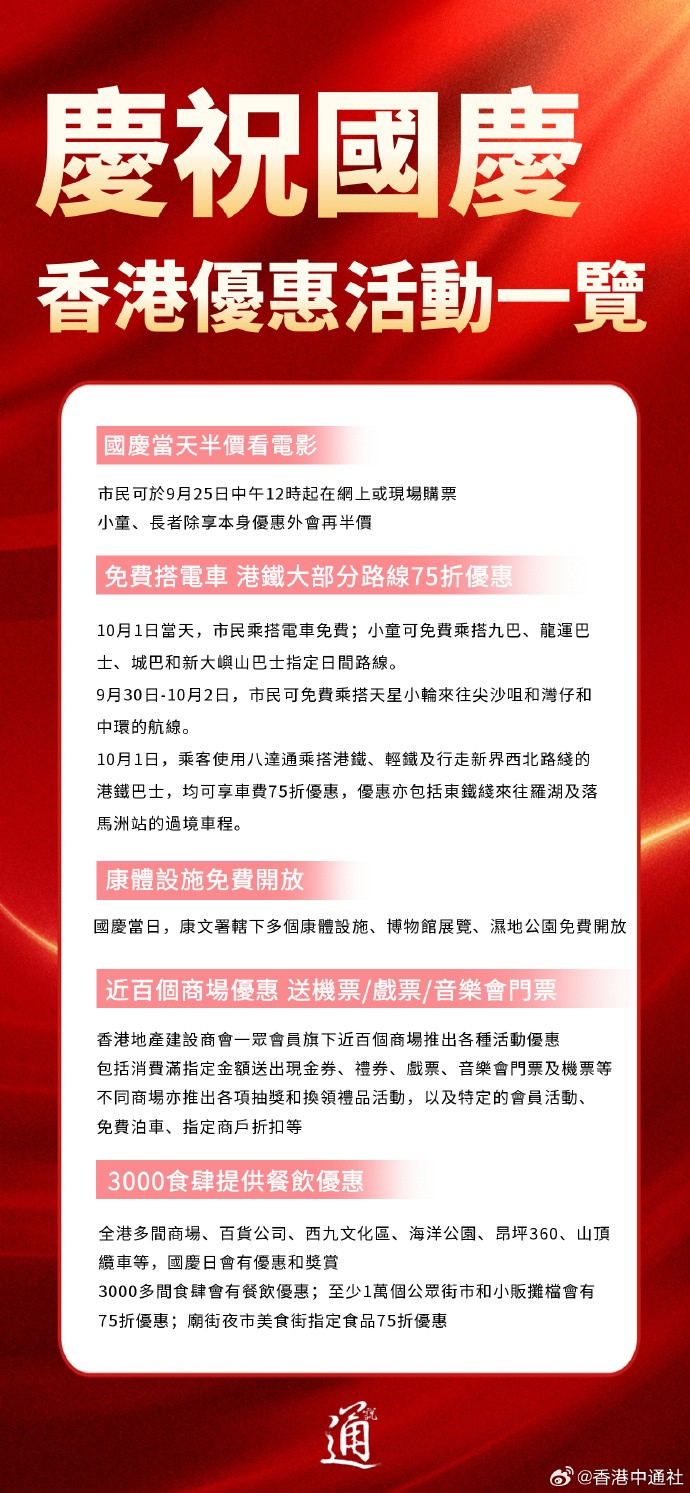 (香港新聞網製圖) 文化藝術及消閒方面,康樂及文化事務署轄下多項收費康樂設施及所有博物館展覽,以及漁農自然護理署轄下的香港濕地公園會於10月1日免費開放。西九文化區管理局、香港海洋公園、昂坪360、山頂纜車有限公司等機構亦會提供不同優惠。 飲食消費優惠及獎賞活動方面,香港商業戲院10月1日的戲票半價。同日,最少1萬個公眾街市及小販攤檔提供七五折購物優惠,約3000間食肆和商戶亦將就指定餐飲品提供優惠。此外,香港國際機場、各大商場及百貨公司、廟街夜巿美食街等會於國慶期間推出優惠或獎賞活動。 現時,香港各項慶祝活動和優惠資訊已上載至專題網站(www.nationalday75.gov.hk),供市民和遊客查閱。(完) 【編輯:劉春】