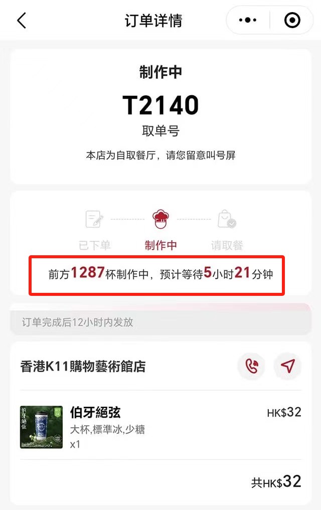 “霸王茶姬”在香港開設了首家門店,選址K11購物藝術館。(香港中通社記者 黃璇攝) 商舖租金下降 內地品牌紛紛進駐香港 自去年以來,香港的商舖租金有所下降,吸引了許多餐飲品牌,包括新茶飲品牌進駐。然而,香港的租金和人工成本仍然比內地高出數倍,而新茶飲的價格僅上漲了一到兩倍,這意味著這些品牌需要銷售更多的飲品來覆蓋成本。 霸王茶姬的首店位於尖沙咀的K11購物藝術館,與喜茶和奈雪的茶相鄰。昨日(29日)正值周日,是霸王茶姬在港開業第二天,香港新聞網記者當日抵達K11商場,現場有消費者向記者反映,上午下單需等2至3小時,而下午則要等超過5小時。社交媒體上也反饋,開業當天,顧客普遍需要等待2到5小時才能品嘗到飲品。今日記者在其點餐小程序上看到,上午11點半的等待時間預估為1小時,到了下午4點半則變為5小時。