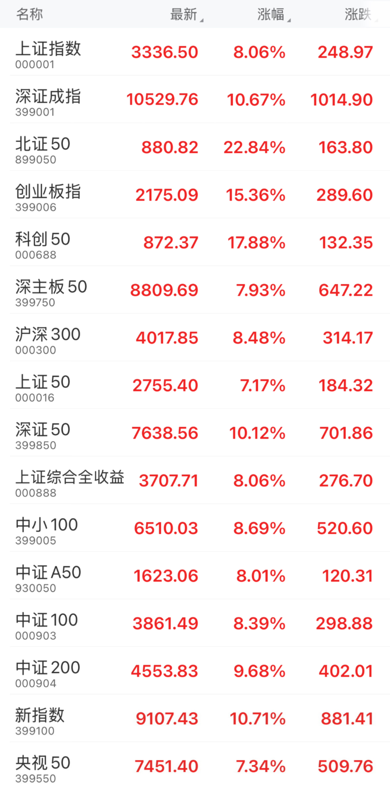 香港中通社9月30日電 9月30日,A股(人民幣普通股票)開盤刷新歷史最快破萬億元(人民幣,後同)紀錄;全天成交超2.6萬億元,創歷史新高。 當天,萬得全A(由上海證券交易所和深圳證券交易所上市的所有A股組成的,反映了所有上市A股價格的整體表現)開盤不足35分鐘成交額已突破萬億大關。這已是A股連續第4個交易日突破1萬億元。 截至當日收盤,上證指數(000001)漲8.06%站穩3300點,深證成指(399001)漲10.67%,創業板指(399006)漲15.36%,科創50、北證50指數均收漲逾15%,同步刷新歷史最好成績。近40隻行業ETF漲停,超3000股漲幅超9%。 本月24日起,中國人民銀行(央行)樓市利好金融政策密集出台,部分已落地。例如,29日晚,中國人民銀行、國家金融監督管理總局發布了優化個人住房貸款最低首付款比例政策的通知,對於貸款購買住房的居民家庭,商業性個人住房貸款不再區分首套、二套住房,最低首付款比例統一為不低於15%(此前是首套房最低首付款比例不低於15%,二套房不低於25%)。