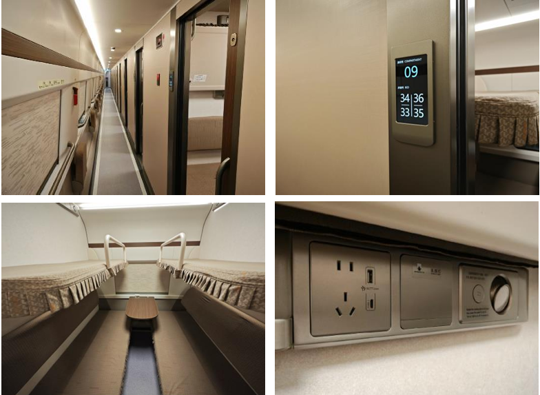復興號臥鋪列車車廂內部設計採用暖木及大地色系,感覺溫暖柔和。軟臥包間設四個有獨立充電插座的臥鋪鋪位。上鋪鋪位加設小型行李存放台,可放置手袋等隨身物品。