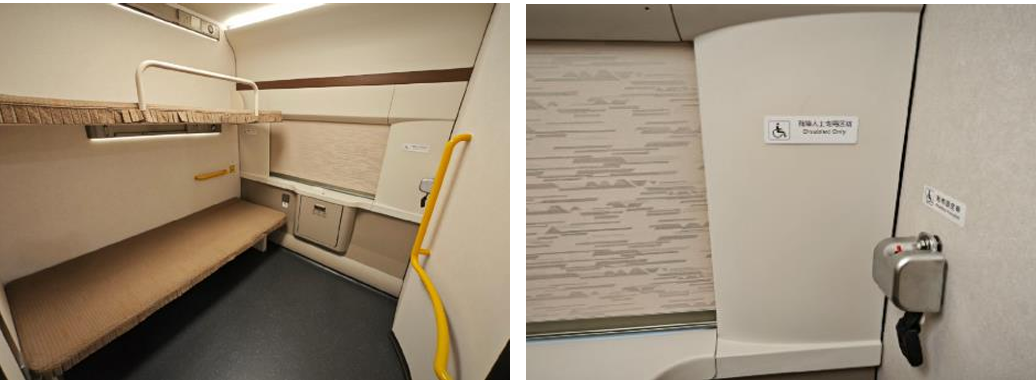 復興號臥鋪列車設有一個無障礙軟臥包間,有兩個臥鋪鋪位及擺放輪椅的位置,方便無障礙出行。