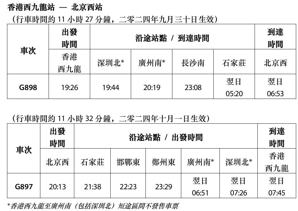 復興號臥鋪列車包括兩卡特等及二等座車廂。 京港滬港高鐵動臥升級為“復興號”列車,是全國首次以“復興號”列車提供臥鋪服務。提質升級後,列車最高運行時速由250公里提高到300公里,北京到香港可提前1小時2分鐘抵達。從北京西站至香港西九龍站的D909/910次升級為G897/898次,上海虹橋站至香港西九龍站的D907/908次升級為G899/900次。10月1日、2日京港、滬港間實行雙向開行,後續安排在旅客出行需求最為集中的每周五、周六、周日、周一雙向開行。 臥鋪列車路綫調整後,來往香港西九龍與北京西站的班次將不停廣州站,改停廣州南站;而來往香港西九龍與上海虹橋站的班次,則新增途經新站點寧波站,令高鐵(香港段)的直達站點增至80個。 來往香港西九龍站與北京西站的復興號臥鋪列車服務時間表 (班次逢周五至周一加班服務)