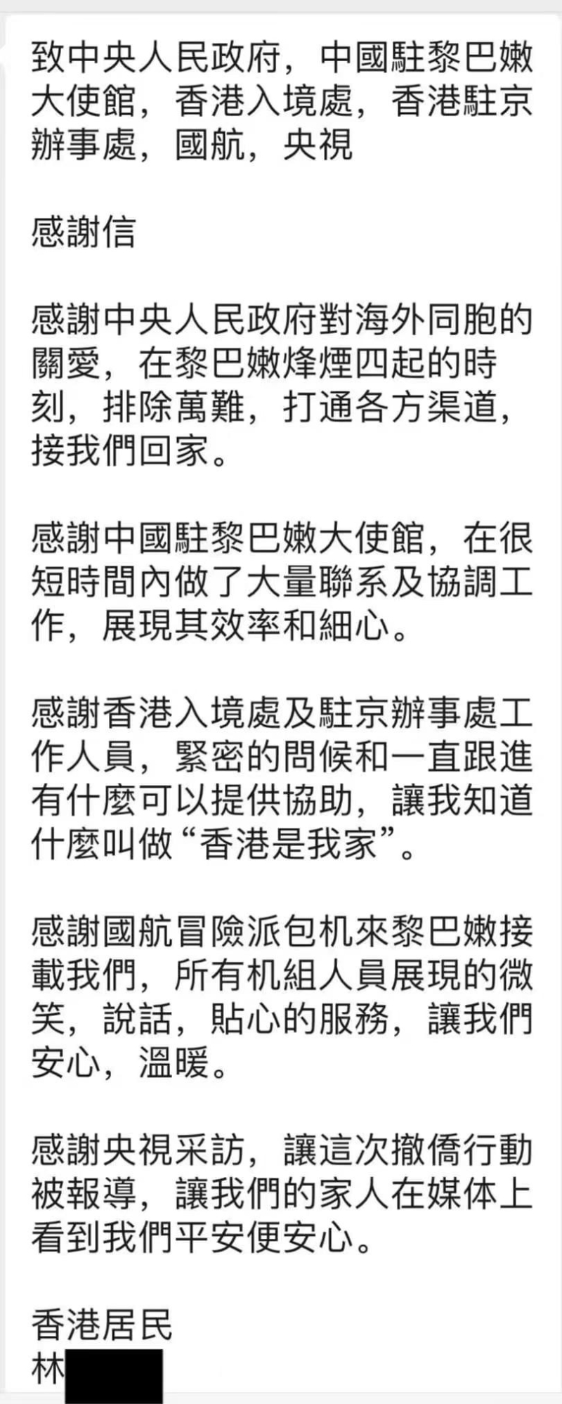 她感謝香港入境處及駐京辦事處工作人員,緊密的問候和一直跟進有什麼可以提供協助,“讓我知道什麼叫做‘香港是我家’”。 “感謝國航冒險派包机來黎巴嫩接載我們,所有机組人員展現的微笑,貼心的服務,讓我們安心,溫暖。”林女士在信中說。 就黎巴嫩局勢,香港入境處一直透過外交部駐港公署及中華人民共和國駐黎巴嫩大使館跟進情況,並發佈多個求助渠道。 鑑於黎巴嫩局勢的最新發展,特區政府已於9月30日提升黎巴嫩的外遊警示級別至黑色,呼籲市民不應前赴當地,並提醒身在黎巴嫩的港人要注意人身安全,並應盡快撤離或轉移至相對安全區域。(完) 【編輯:譚暢】