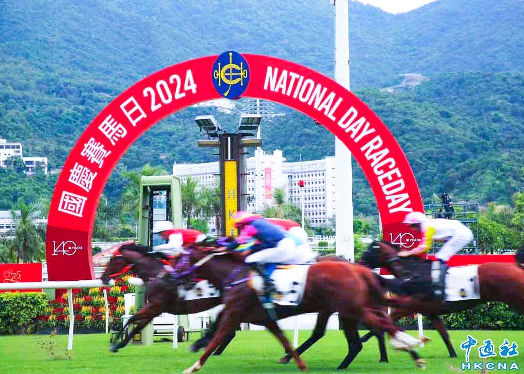 為賀中華人民共和國成立75周年,香港沙田馬場10月1日舉行國慶賽馬日。馬場中遊人如織,座無虛席,市民遊客皆盡興觀看比賽,共同歡慶。(香港中通社記者 陳卓儀攝)香港中通社圖片