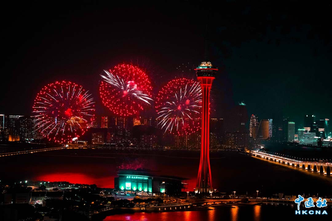 10月1日,澳門國際煙花比賽匯演第五場國慶夜上演,中國與意大利煙花在旅遊塔對開海面夜空綻放,為國慶夜增添節日氣氛。香港中通社圖片