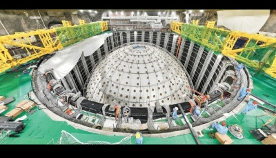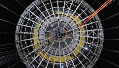 10月9日拍攝的建設中的江門中微子實驗中心探測器(拼接照片)。新華社圖片 據央視報道,江門中微子實驗以測量中微子質量順序為首要科學目標,并進行其它多項重大前沿研究,其核心探測設備位於地下700米的實驗大廳內44米深的水池中央,它由直徑41米的不銹鋼網殼、直徑35.4米的有機玻璃球,以及2萬噸液體閃爍體、45000只光電倍增管等關鍵部件組成。 江門中微子實驗2013年立項,2015年開工建設地下實驗硐室,2021年底,地下硐室交付使用并開始探測器安裝。目前,江門中微子實驗中心探測器最內層的有機玻璃球已合攏,外層的不銹鋼網架和光電倍增管也在有序合攏中,預計11月底完成全部安裝任務,并啟動超純水、液體閃爍體的灌裝,2025年8月正式運行取數,預計運行約30年。 中微子是宇宙形成之初就存在的最古老也最原始的基本粒子,攜帶著非常多重要的神秘信息,研究中微子對於認識宇宙和我們現存的世界物質都具有非常重要的意義,也是國際最前沿的基礎科學。 江門中微子實驗有機玻璃球內徑35.4米,由263塊12厘米厚的烘彎球面板和上下煙囪粘接而成,有機玻璃淨重約600噸,是世界最大的單體有機玻璃球。事實上,相比其35.4米的直徑,12厘米厚的有機玻璃球按比例換算,就好像雞蛋殼一樣薄。有機玻璃板材生產採用獨特配方和工藝,具有高透光率和低本底的特點,其天然放射性本底鈾和釷的質量占比小於一萬億分之一。有機玻璃球粘接採用大體量注料、聚合、退火的本體聚合技術,粘接縫總長度約2公里,并採用特殊方法對粘接縫進行保護。 有機玻璃球作為探測中微子的靶物質液閃的容器,將承載20000噸液閃,同時整個球體置於純水中運行,運行中需要長期承受約3000噸的浮力,該受力通過有機玻璃節點、連接桿和不銹鋼節點傳遞到不銹鋼網殼主結構上,在連接桿上裝有傳感器進行受力監測。特殊設計的不銹鋼結構預埋入有機玻璃中作為有機玻璃節點,經過反複設計優化和上百次試驗最終獲得超高承載能力,并且部分不銹鋼節點採用碟簧設計方案、有效改善了有機玻璃節點的受力分布。 為了建造這一大科學裝置,江門中微子實驗團隊集智攻關、多措并舉,攻克多項技術難關: 1.成功研製出具有自主知識產權的國際最高光子探測效率的光電倍增管,打破了該領域的國際壟斷,并獲歐盟、美國、日本等的專利授權。 2.研製出高強度、高精度、高透光率光電倍增管水下防爆系統。 3.研發了高潔淨度、高密封、高效率的液體閃爍體(簡稱液閃)純化系統,獲得目前國際上衰減長度最高的液閃。 4.採用水下電子學的創新設計,以民用器件實現了航天級別的可靠性。 5.完成有機玻璃球、不銹鋼網架等探測器關鍵部件的設計、研製、批量生產及安裝。 6.建成國內最大跨度的深埋地下洞室,該洞室頂部起拱跨度達49.5米,相關施工屬於世界級的超常規地下工程。 江門中微子實驗建成後將成為國際中微子研究的中心之一,與日本的頂級神岡中微子實驗和美國的深部地下中微子實驗形成中微子研究的鼎足之勢。這將使中國在中微子研究領域的國際領先地位得到進一步鞏固。(完) 【編輯:俞丹鳳】