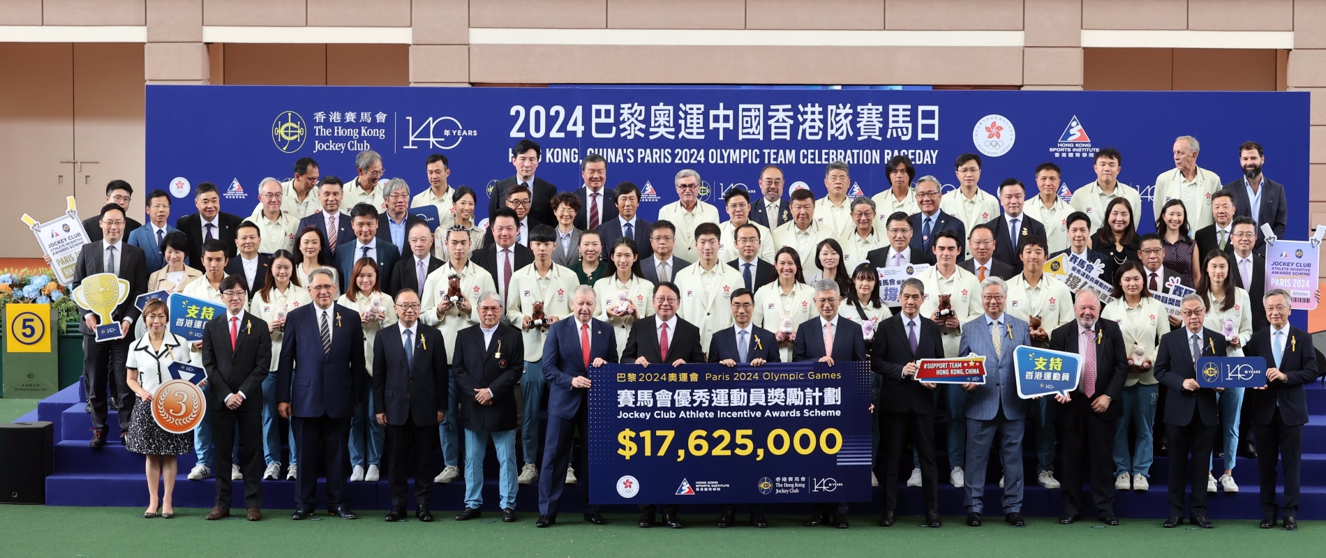 香港賽馬會舉辦2024巴黎奧運中國香港隊賽馬日嘉許優秀運動員香港新聞網10月13日電 香港賽馬會13日於沙田馬場舉行“2024巴黎奧運中國香港隊賽馬”,表揚中國香港代表團在今屆巴黎奧運會歷史性勇奪兩金、兩銅的驕人成績。賽馬日同場進行“賽馬會優秀運動員獎勵計劃”支票頒贈儀式,向於巴黎奧運會取得獎牌及排名第四至八名的運動員,發放合共1,762萬5千港元獎金。 多名巴黎奧運中國香港隊代表,包括勇奪獎牌的劍擊運動員張家朗、江旻憓,以及游泳運動員何詩蓓;政府官員、中國香港體育協會暨奧林匹克委員會、香港體育學院及體育總會代表,齊集沙田馬場,同賀運動員凱旋,為港爭光。