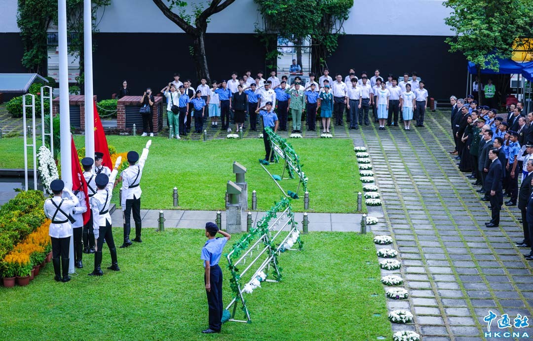 10月11日,香港特區政府於上午8時正在香港大會堂紀念花園舉行官方紀念儀式,悼念於一九四一至四五年間為保衞香港而捐軀的人士。圖為升旗儀式。(香港中通社記者 曹文毓攝)