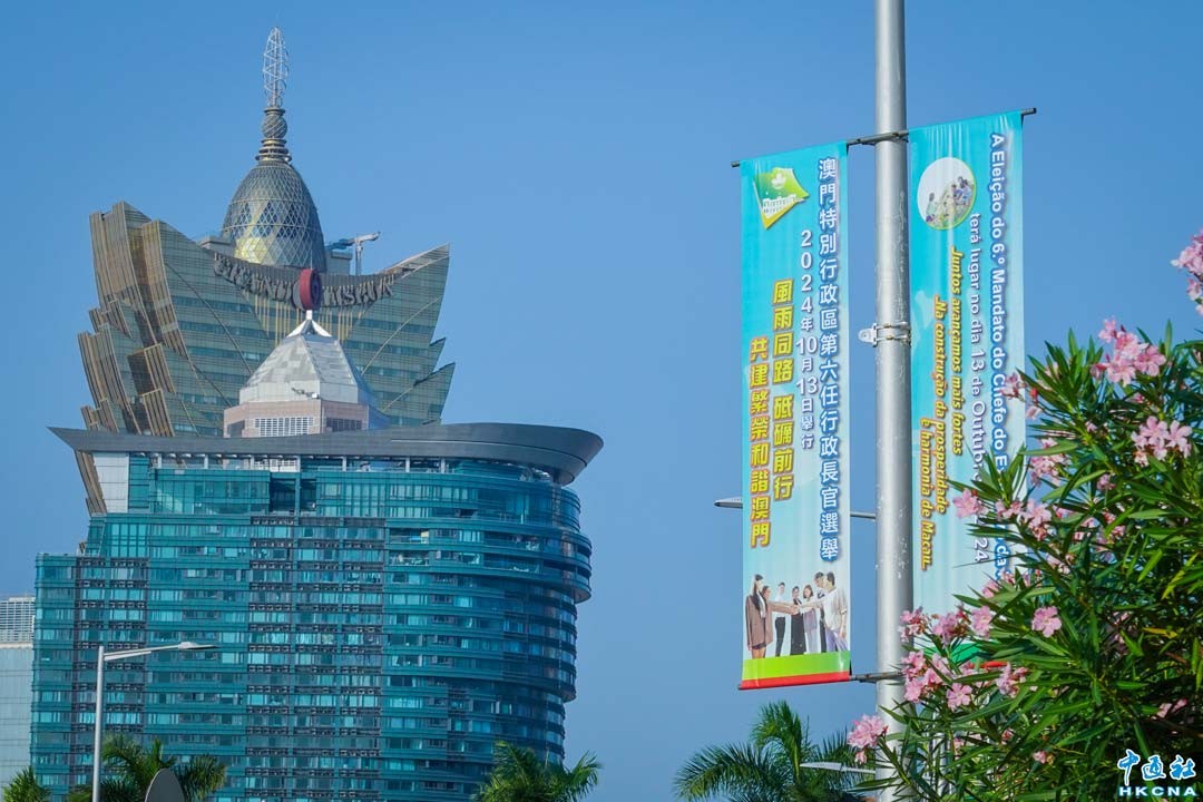 10月12日,澳門特首選舉場地中國與葡語國家商貿合作服務平台綜合體準備就緒。澳門特別行政區第六任行政長官選舉明日(13日)上午舉行,相關投票站設置及所有選舉安排都已准備就緒。圖為會場周邊掛滿選舉相關海報。(香港中通社記者 謝光磊攝)