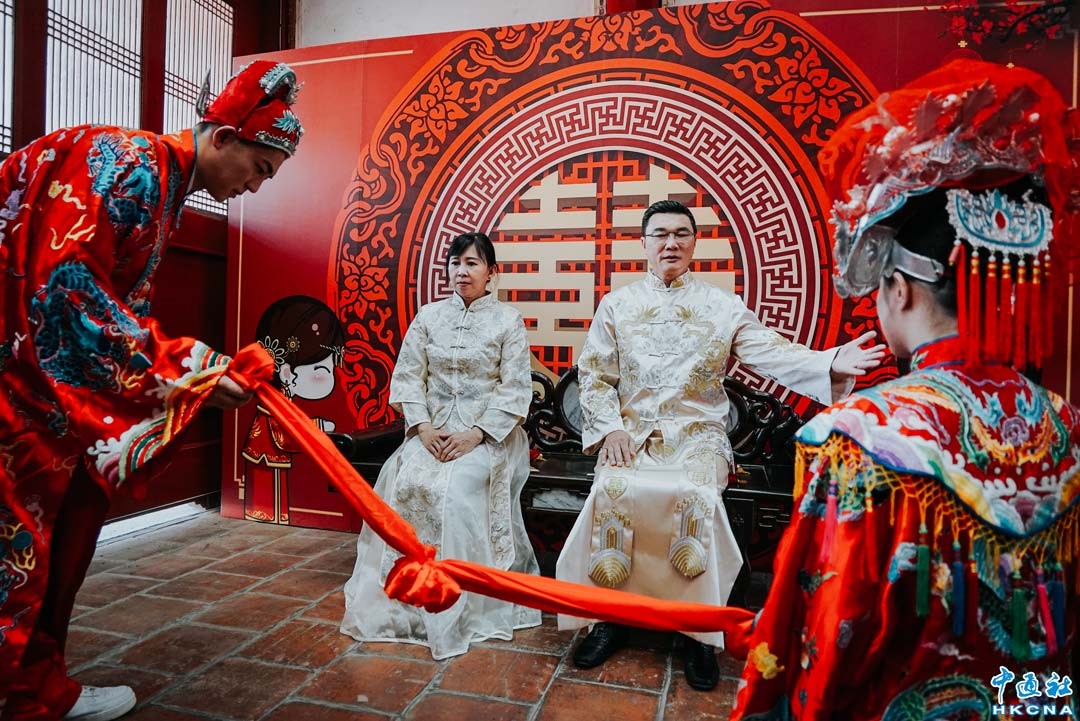 台灣彰化縣鹿港鎮10月12日起在文開書院舉行“古式婚禮迎親”,由前來迎親的新郎騎著白馬,帶領著新娘花轎,伴隨著金香燭炮、聘金、項鍊、戒指、龍眼、冬瓜、酒、喜餅、喜糖等傳統“十二禮”,浩浩蕩蕩的踩街迎親前往會場,沿途發放喜糖分享喜悅並接受大家的祝福,復刻呈現了早期傳統婚禮習俗,讓鄉親遊客們無不駐足,感受早期婚嫁習俗的熱鬧場面。 香港中通社圖片
