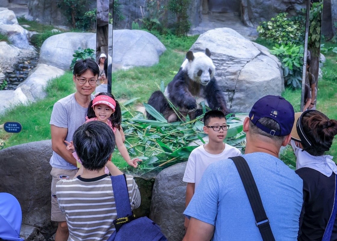 資料圖為香港海洋公園大熊貓館吸引遊客。香港中通社圖片 記者會現場播放影片,大熊貓寶寶已脫離保溫箱,在嬰兒床上一邊爬行一邊叫喚,聲音高昂有力,全身長滿毛髮的大熊貓寶寶背影十分圓潤,猶如一顆黑芝麻湯圓。另一條影片中,護理人員正在餵食,大熊貓寶寶趴在護理員腿上喝奶,體型與人類嬰兒差不多大,需要雙手托舉。 據介紹,大熊貓姐姐和弟弟現時體重分別是2700克和2500克,相比剛出生時僅重100多克、體積如巴掌大小,長大了許多。姐姐相對溫柔文靜,弟弟則有雄性氣概。 香港海洋公園動物及保育主管祝效忠表示,兩隻大熊貓寶寶現時仍要24小時監察和照顧,估計當兩姐弟6個月大時,即約農曆新年前後,可與公眾見面。 護理人員稱,“盈盈”是高齡初產,需要更多時間恢復,目前已康復七至八成,產後情緒、飲食習慣都有變化,人員會持續觀察,又指“盈盈”母性很強,照顧子女時十分專心。(完) 【編輯:林曉惠】