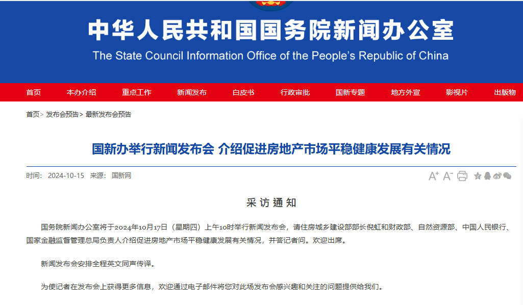 香港新聞網10月16日電 國務院新聞辦公室昨(15日)晚上發佈消息,將於10月17日上午10時舉行新聞發佈會,住房城鄉建設部部長倪虹和財政部、自然資源部、中國人民銀行、國家金融監督管理總局負責人介紹促進房地產市場平穩健康發展有關情況,并答記者問。