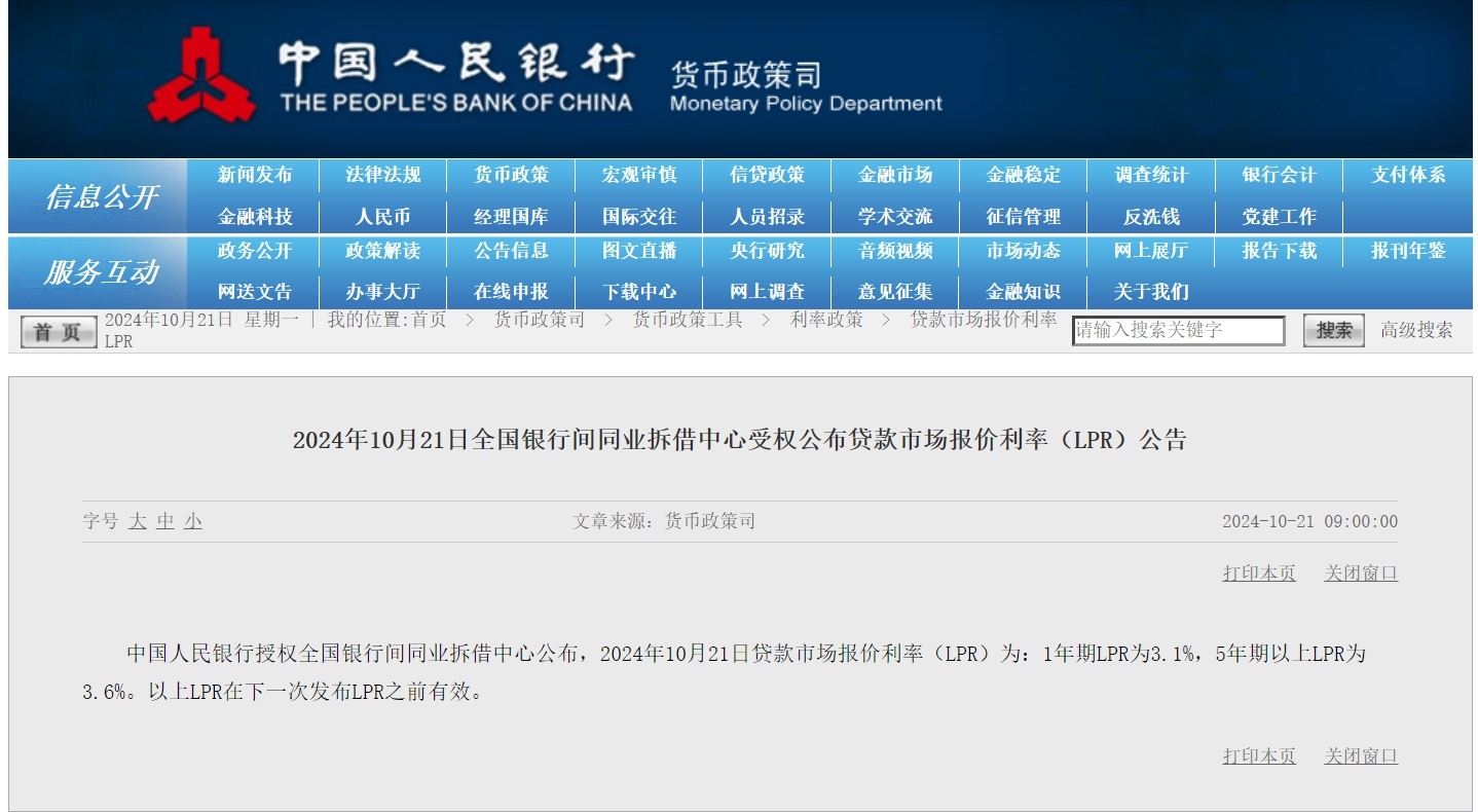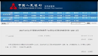 內地今降LPR 股市或進入“長牛”香港新聞網10月21日電 10月21日,中國人民銀行授權全國銀行間同業拆借中心公佈,2024年10月21日貸款市場報價利率(LPR)為:1年期LPR為3.1%,5年期以上LPR為3.6%。兩者減幅均略大於市場預期0.05個百分點。