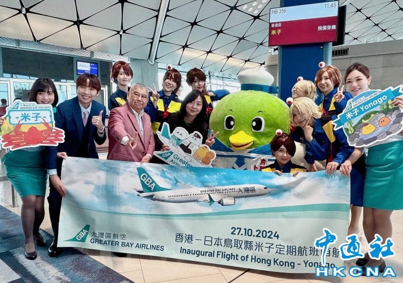 •   10月27日,大灣區航空正式開辦香港至日本鳥取縣米子市的定期航班服務,成為該公司繼東京及大阪之後第三個往來日本的定期航點。圖為嘉賓在香港國際機場首航合影。(香港中通社記者 黃璇攝) 香港中通社圖片