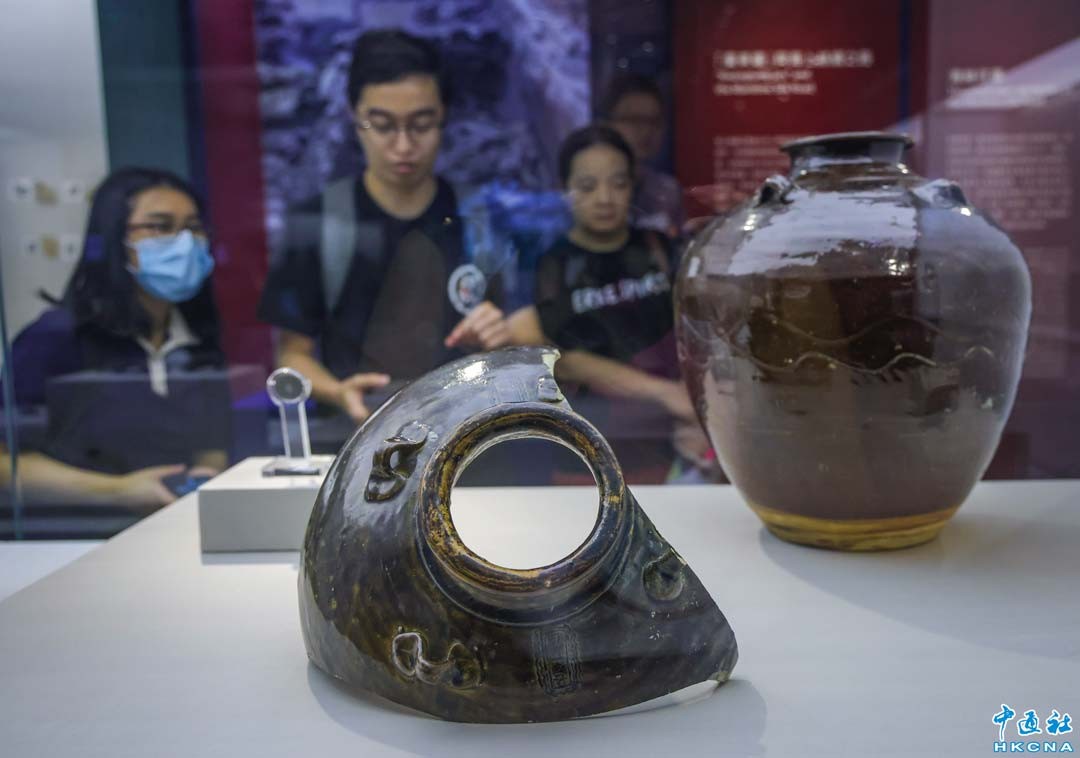 由發展局、國家文物局和澳門特區政府社會文化司合辦的“從灣區啓航:‘南海I號’與海上絲綢之路”展覽在九龍公園香港文物探知館舉辦,展出“南海I號”遠洋商船的出土文物及粵港澳三地的相關文物。是次展出的255項展品中,有來自“南海I號”的南海窰醬釉“淳熙十年”印文四繫罐、景德鎮窰青白釉印花枝梅紋花口碗、龍泉窰青釉刻劃蓮紋折腰花口碟、金單頂鏈犀角形錐筒飾項鍊、鑲寶石空心金鐲等,吸引不少市民參觀。(香港中通社記者 曹文毓攝)