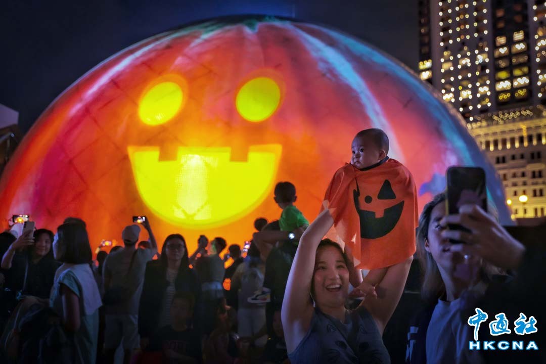萬聖節臨近,大批市民和遊客在香港太空館觀賞“哈囉威香港”3D光雕匯演。位於尖沙咀的香港太空館每晚8時15分至10時30分搖身一變,以巨型南瓜﹑白色幽靈﹑菠蘿包﹑銀河及蝙蝠的光影造型動感登場,配以音樂,將萬聖節的樂趣帶給市民和旅客,成為城中晚間不能錯過的萬聖節打卡焦點之一。(香港中通社記者 謝光磊攝)