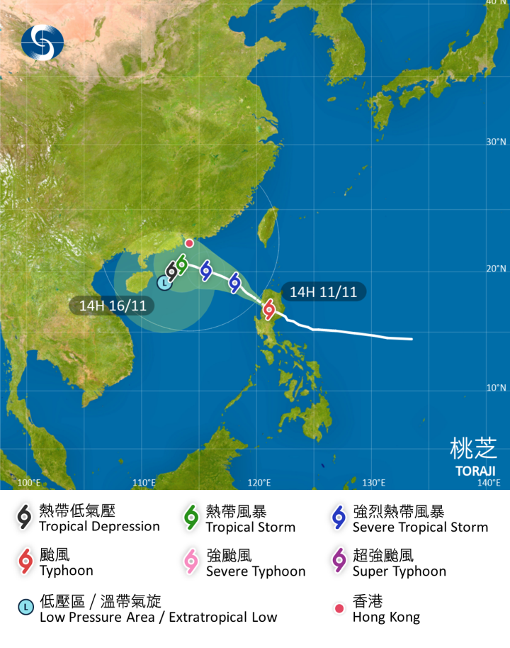 香港新聞網11月11日電 熱帶氣旋“桃芝”已橫過呂宋,即將進入香港800公里範圍。香港天文台表示11日表示,將會在當晚10時20分發出一號戒備信號。