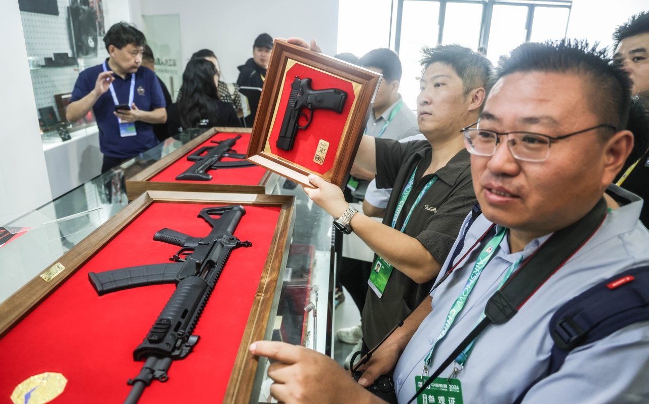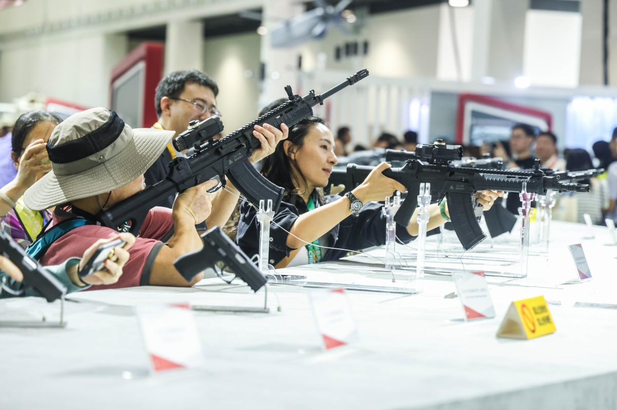 中國兵器館人流旺盛,市民在試玩槍械
